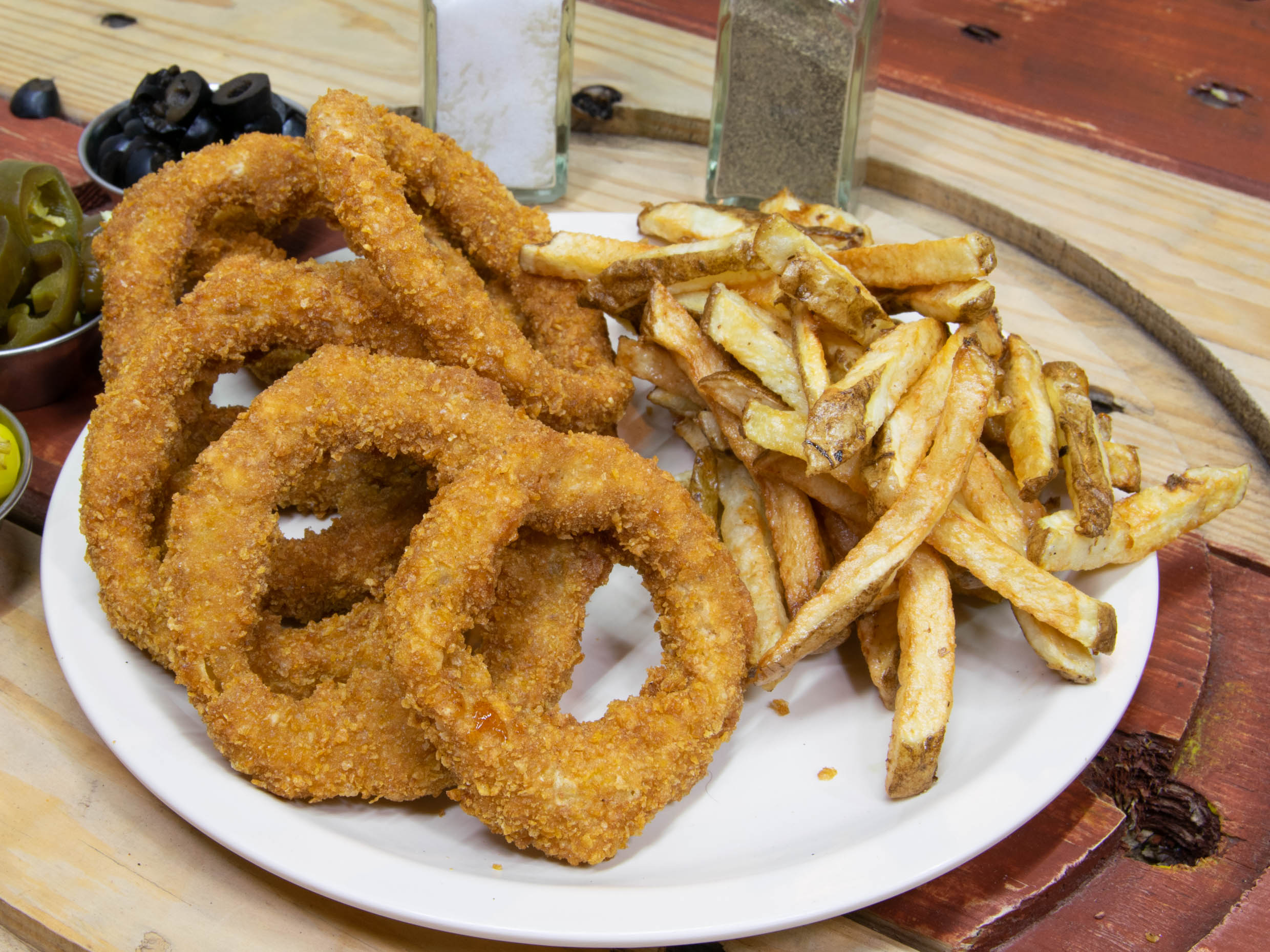 10 PIEZAS DE AROS DE CEBOLLA ACOMPAÑADOS DE PAPAS CHIPOTLE,CATSUP,QUESO Y RANCH