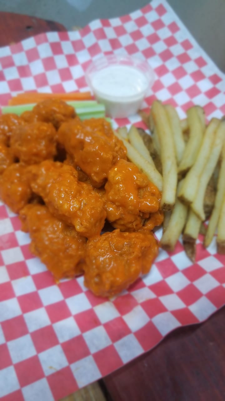 Bubas acompañadas de papas y boneless.
