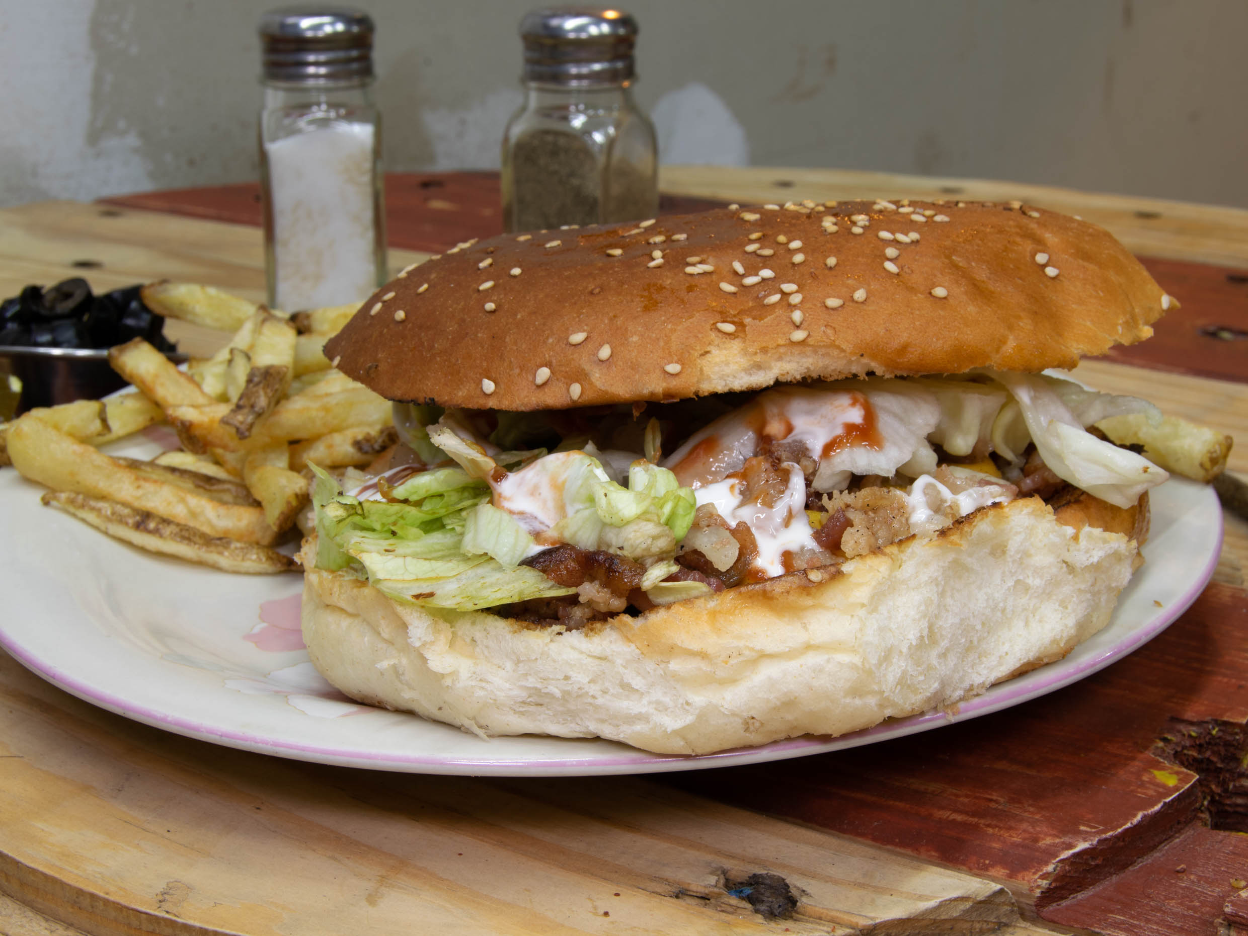 HAMBURGUESA PREPARADA CON PAN DE PANADERÍA, CARNE DE RES CON RECETA DE LA CASA, ELABORADA CON 2 CARNES, QUESO, TOMATE, CATSUP, MAYONESA, MOSTAZA, LECHUGA Y ACOMPAÑADA DE PAPAS FRITAS.