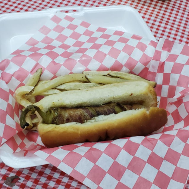 salchicha rellena de queso envuelto en chile y tocino