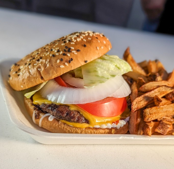 Hamburguesa con carne de res, queso amarillo, lechuga, tomate, cebolla, mayonesa, catsup y mostaza, acompañada de una porción de papas fritas.