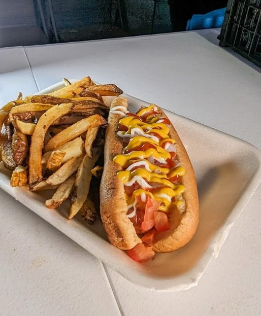 Hot dog de salchicha de res con tomate, cebolla, mayonesa, cátsup y mostaza, acompañado de una porción de papas fritas