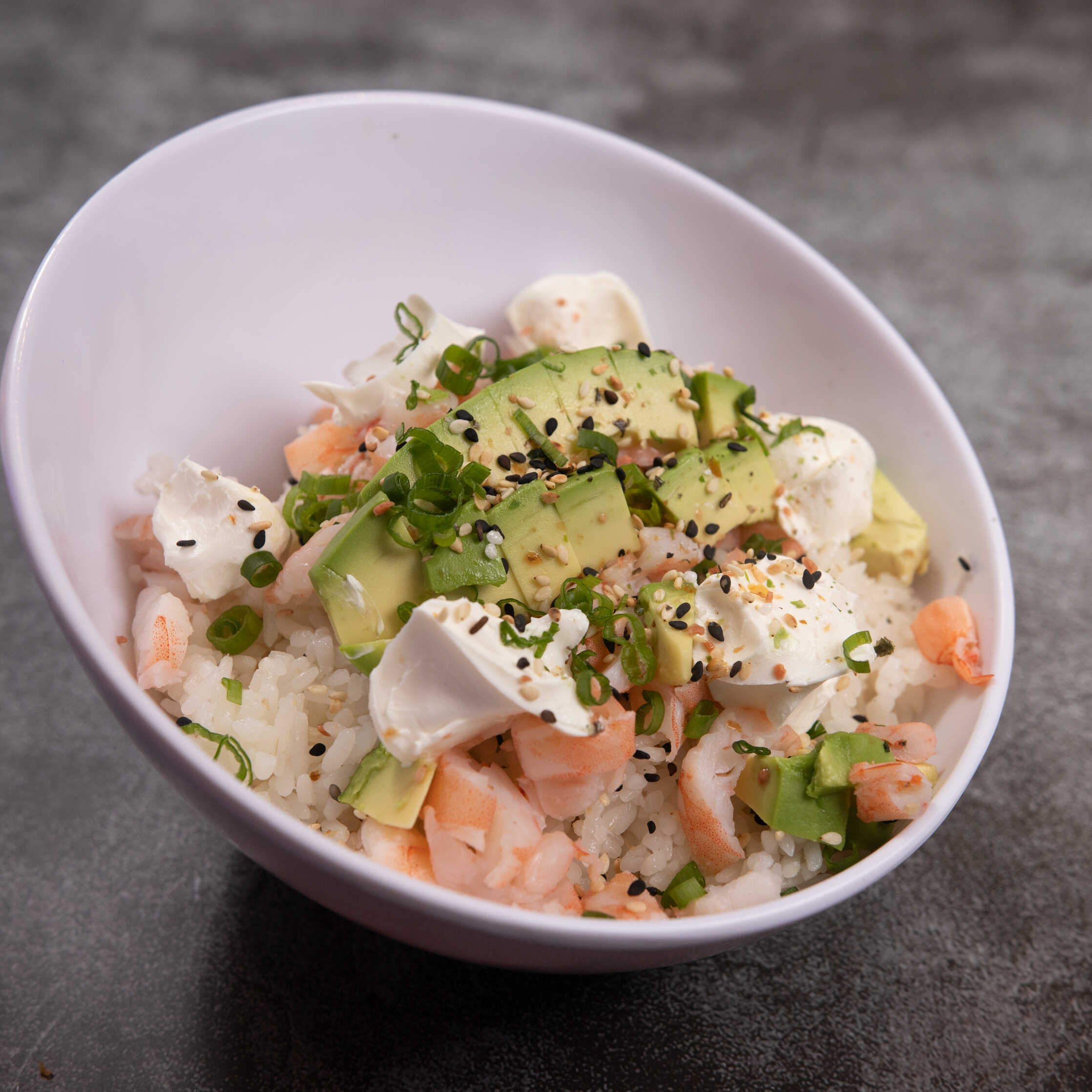Arroz blanco con surimi, atún, camarón cocido, salmón, tampico spicy y aguacate.