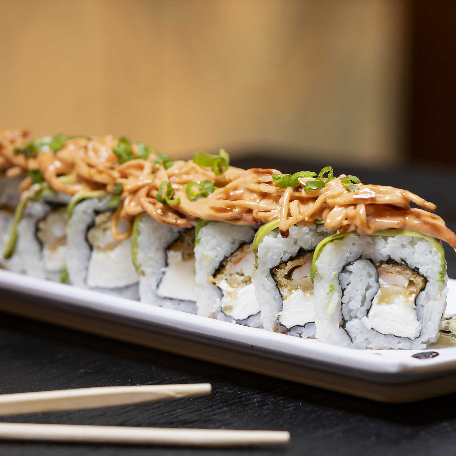 Por dentro philadelphia, aguacate, camarón, carne, por fuera queso manchego, cangrejo empanizado con un aderezo del chef y salsa especial.