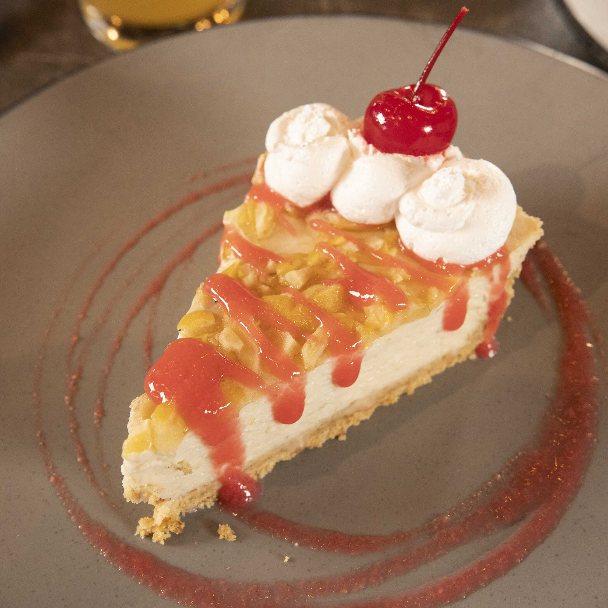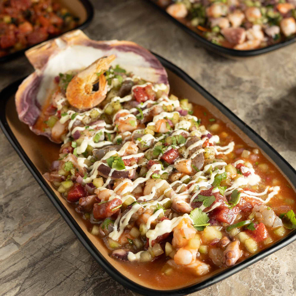 Camarón curtido en limón, camarón cocido picado en pequeños trozos, cuadros de atún fresco, mango (temporada) cebolla morada, pepino, salpimentado, mezclado en salsas de la casa, ralladura de jícama, bañado en salsa chamoy.