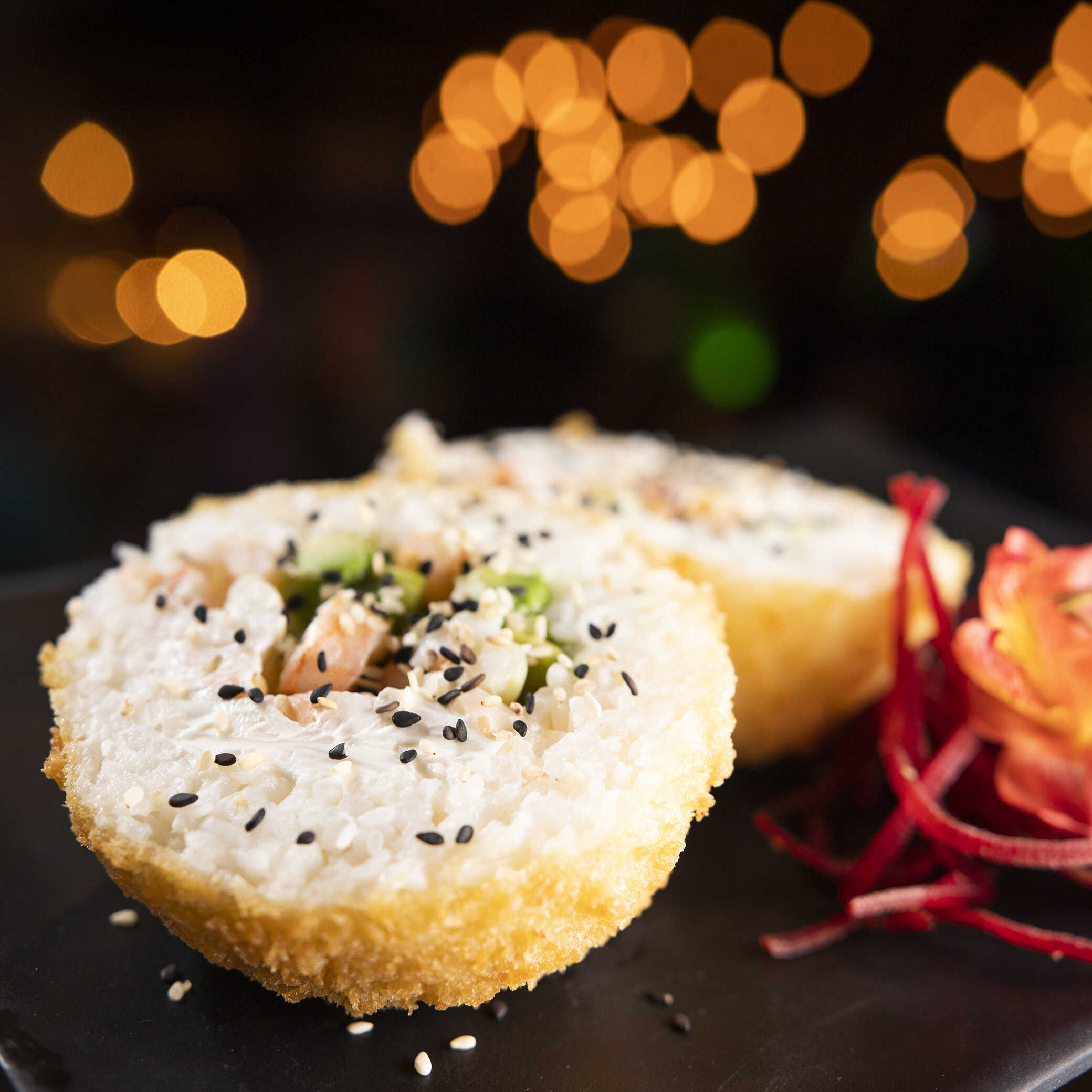 Por dentro Philadelphia, pepino, zanahoria y aguacate, por fuera semillas de sésamo.