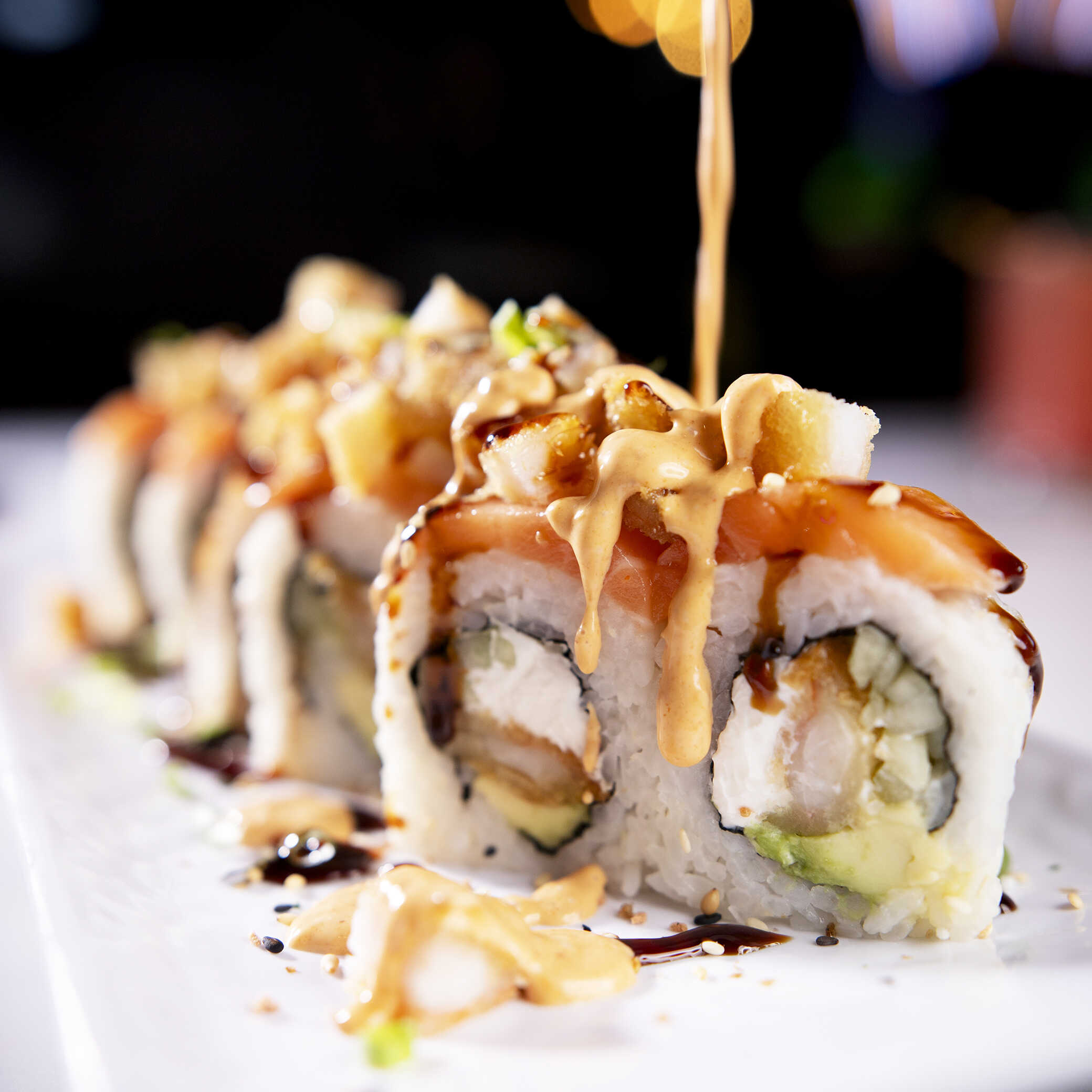 Por dentro pepino, aguacate, philadelphia, camarón, por fuera cubierto de salmón bañado en un aderezo del chef y una salsa especial.