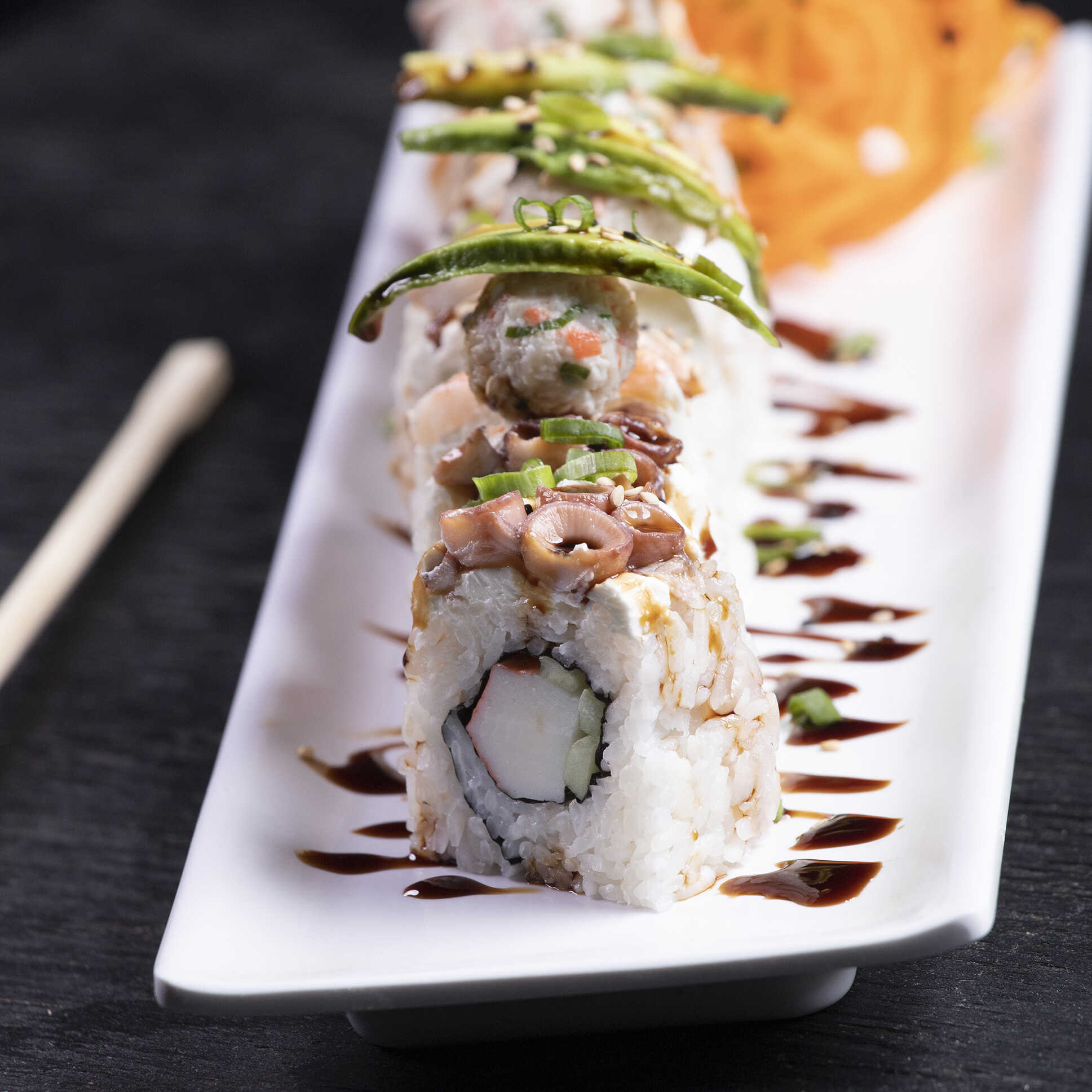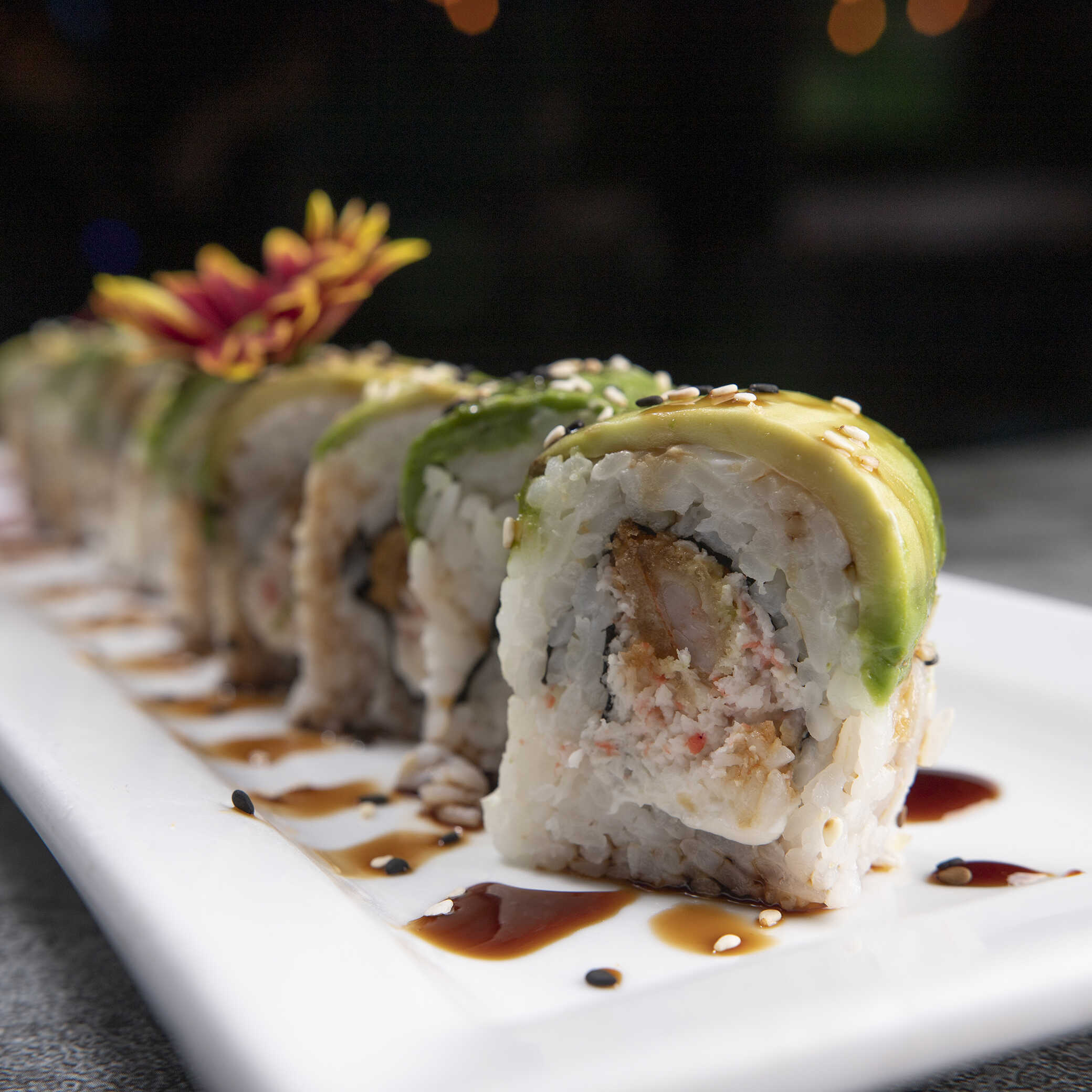 Por dentro philadelphia, camarón empanizado, por fuera cubierto de aguacate, topping de ensalada de cangrejo, bañado en salsa de anguila y cilantro.