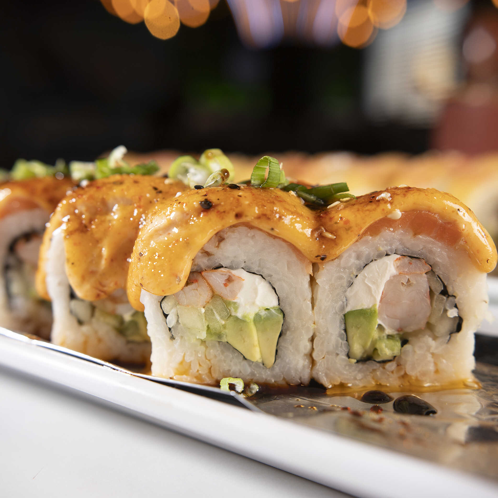 Rollitos rellenos de queso crema, camarón, aguacate y sriracha.