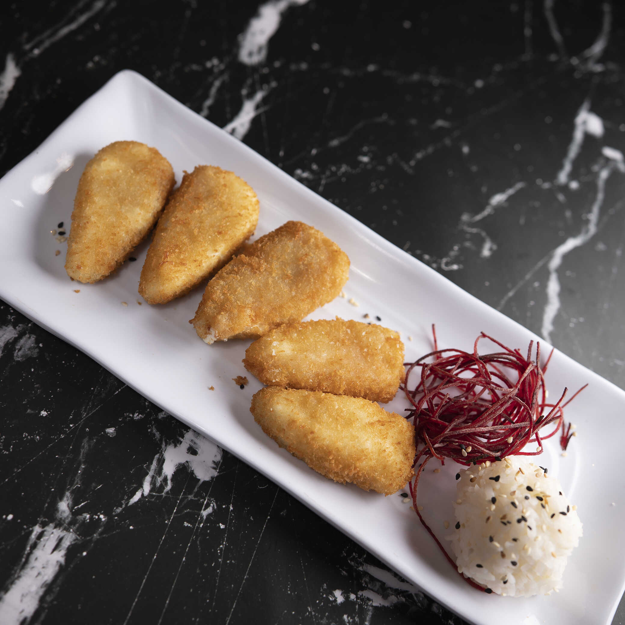 Bola de arroz rellena de queso crema, tampico y una proteína a elegir.