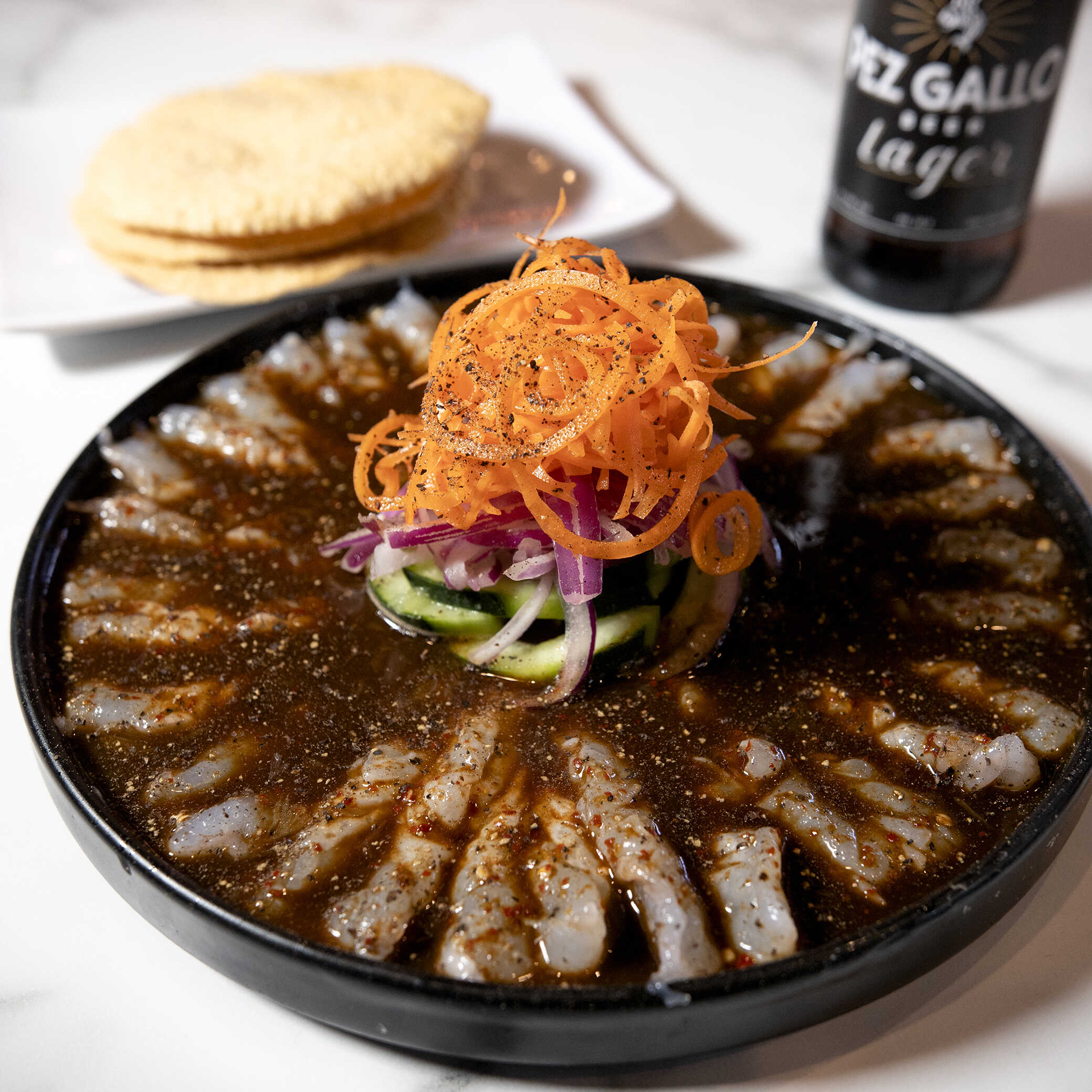 Camarón curtido en limón, corte mariposa, salpimentado, cebolla morada en juliana, pepino y salsa ancla negra.