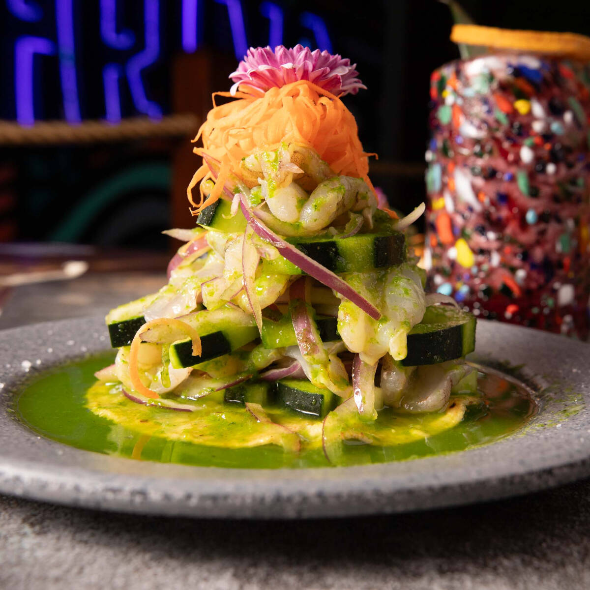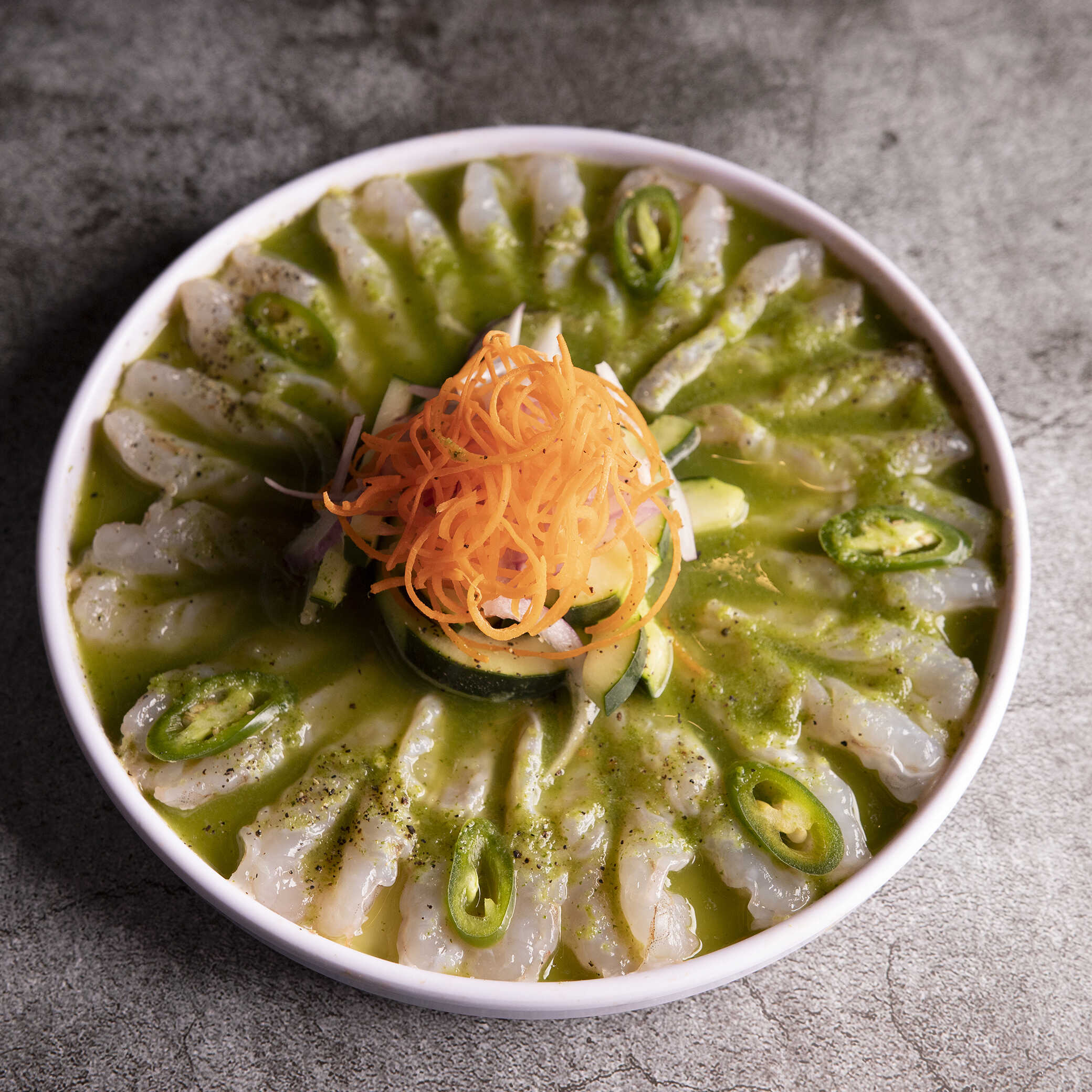 Camarón curtido en limón, corte mariposa, salpimentado, cebolla morada en juliana, pepino y salsa verde.