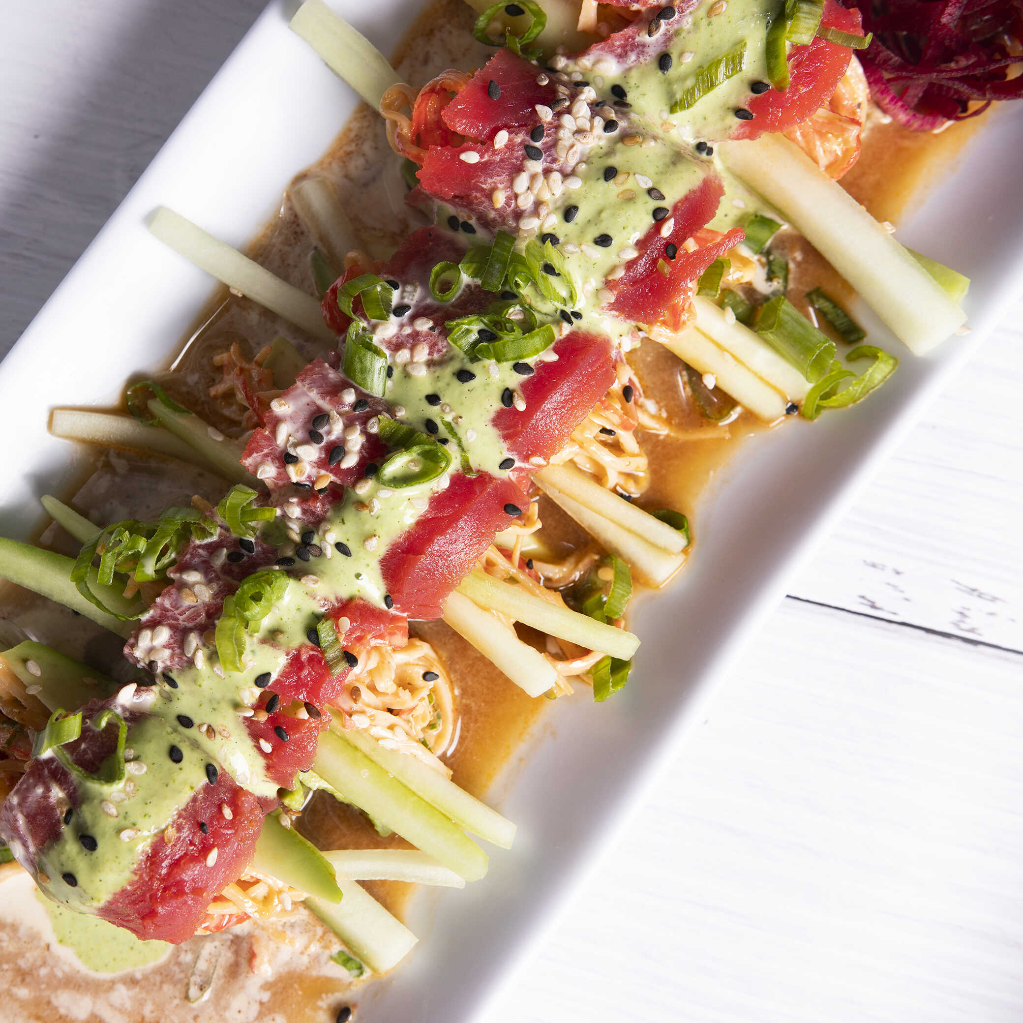 Cubo de atún fresco curtidas en limón, salseado con un toque de picor, cama de aguacate y topping de ralladura de jícama bañado en una salsa de jamaica.