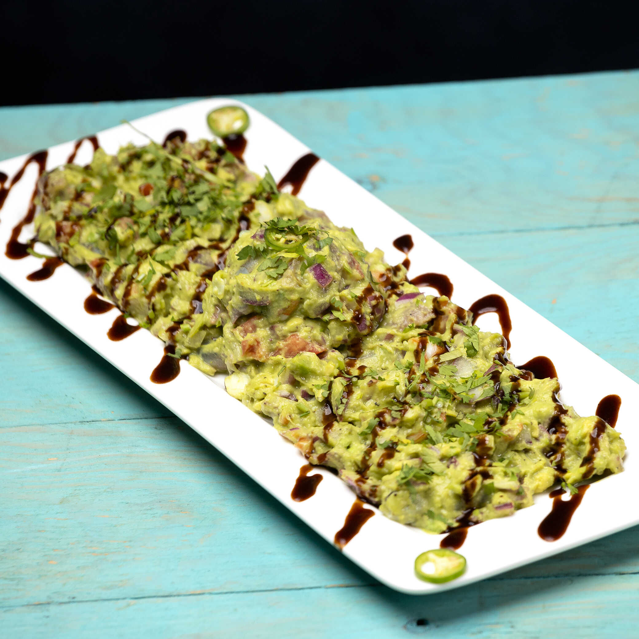 Láminas de atún fresco curtidas en limón, marinado en aderezo chipotle, cama de aguacate, salpimentado con un topping de cebolla dulce.
