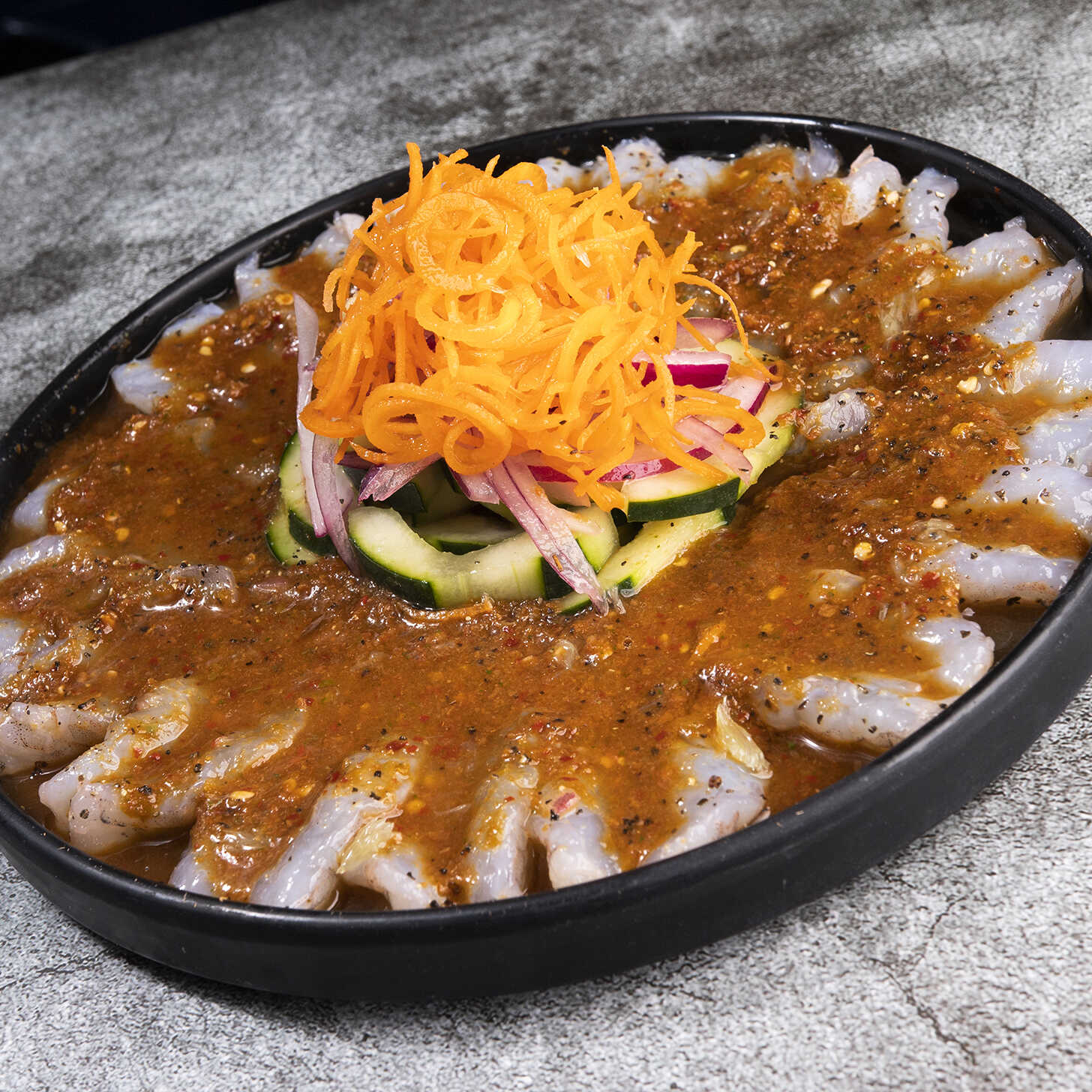 Láminas de atún en salsa ancla negra, camarón curtido, pepino y cebolla en juliana.