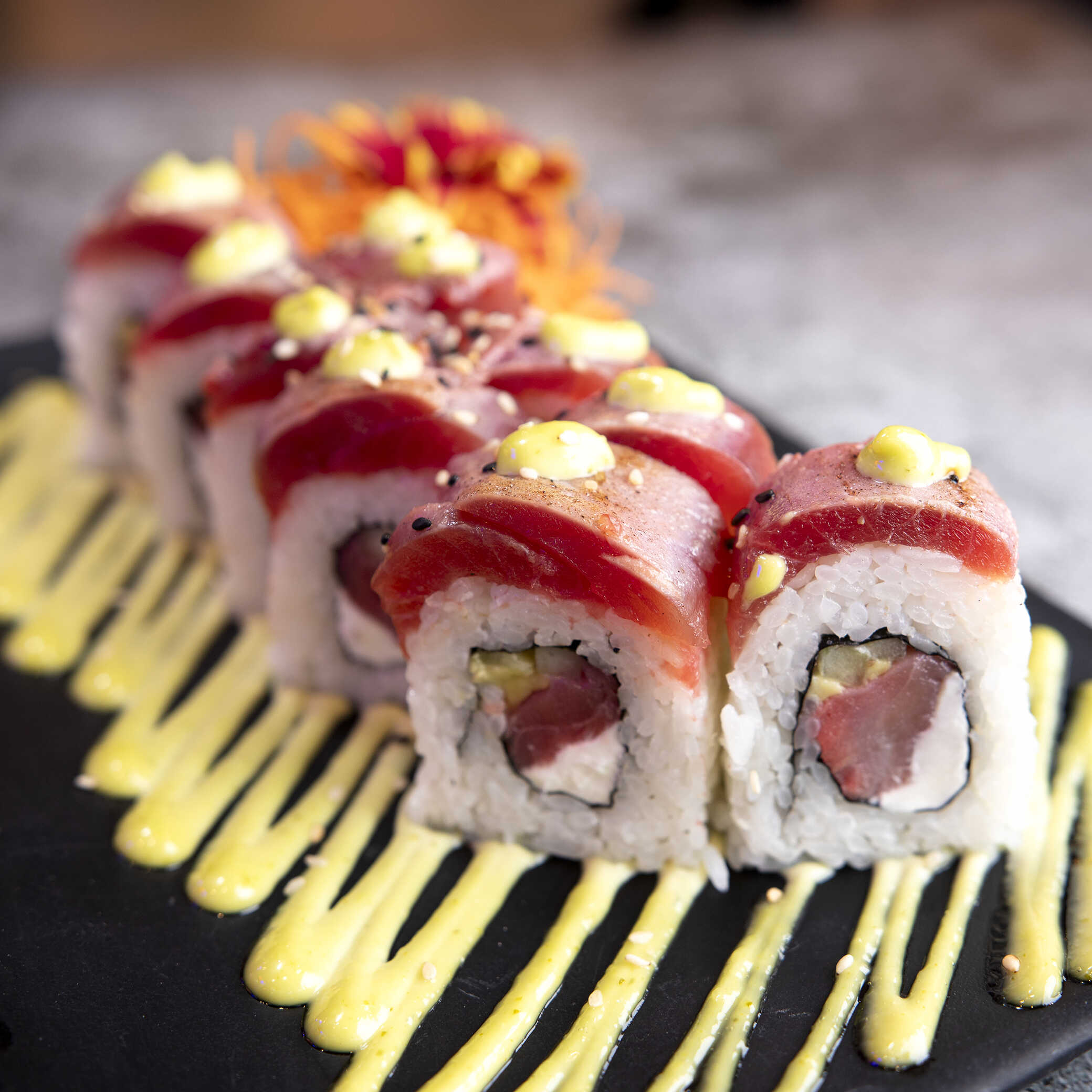 Por dentro pepino, aguacate, queso, atún, por fuera atún sellado y aderezo de cilantro.