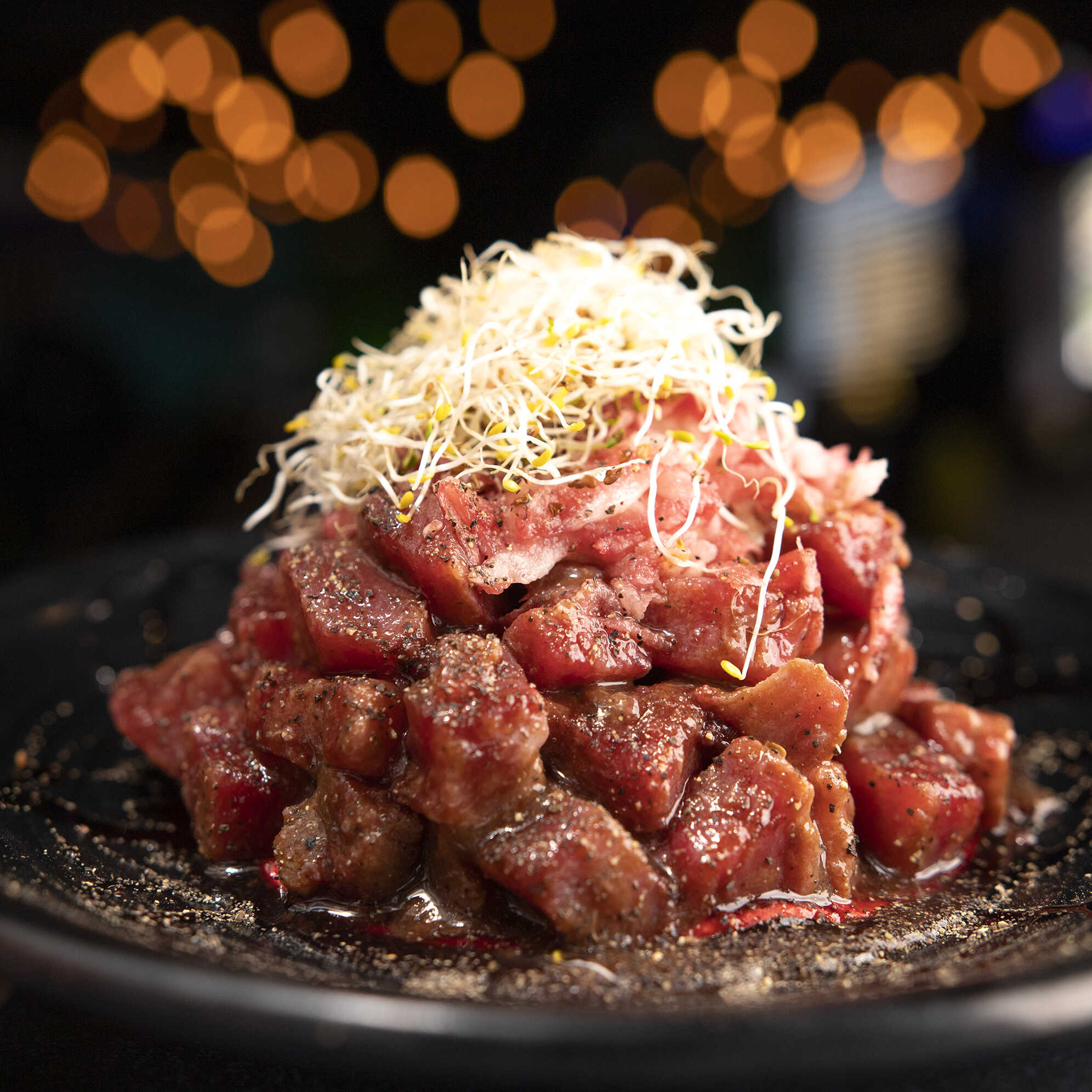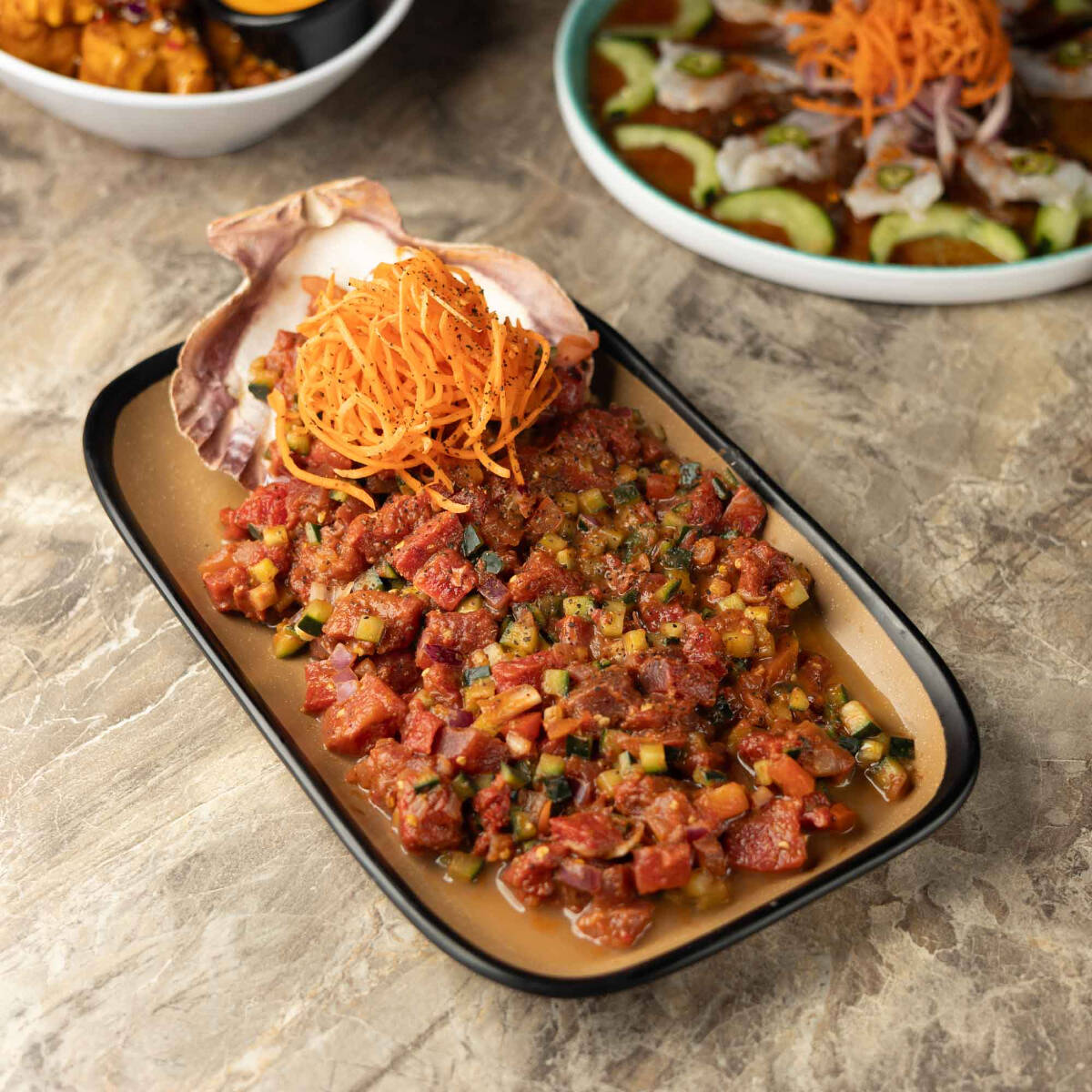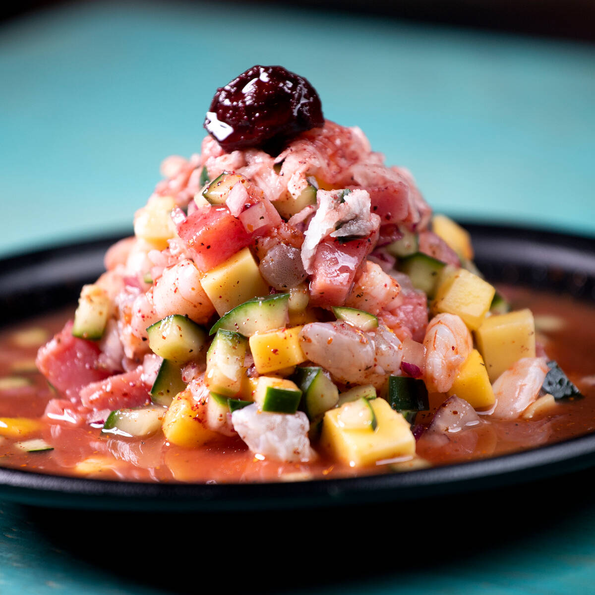 Cubos de atún fresco curtidos en limón, cebolla morada, pepino, tomate finamente picados mezclados en una salsa negra picante.