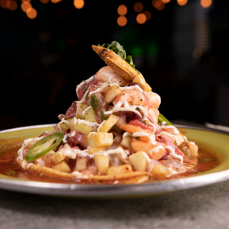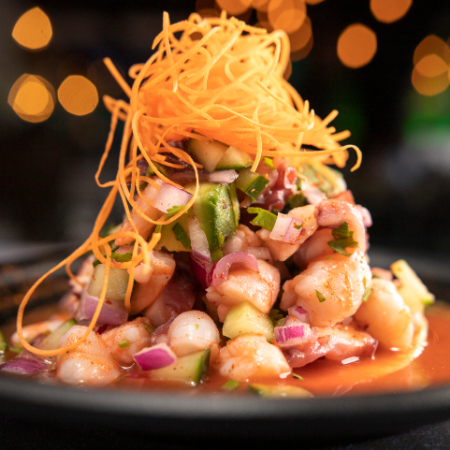 Camarón cocido, camarón curtido en corte mariposa, camarón seco, pulpo, atún, cebolla morada en juliana, pepino salpimentado, mezclado con salsas especiales de la casa y un toque de picor.