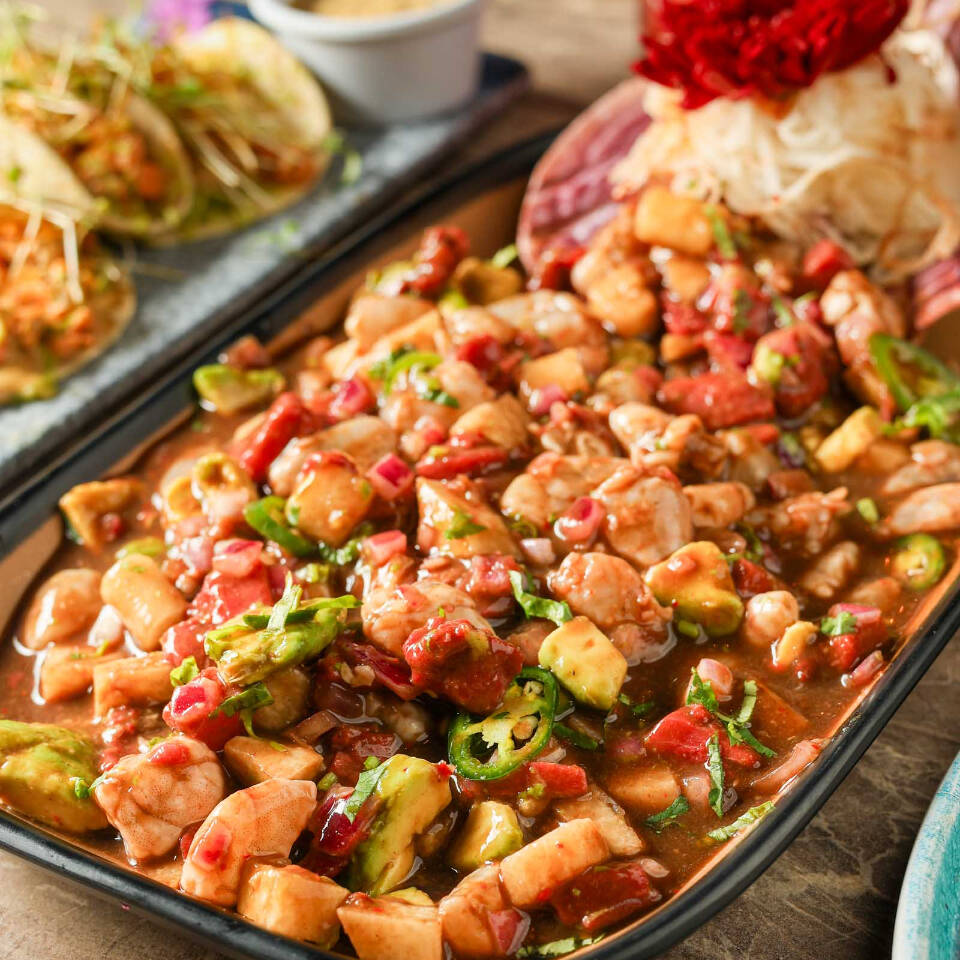Camarón curtido picado, atún, jícama, cebolla morada, aguacate, cilantro, chile de árbol y salsas de la casa.