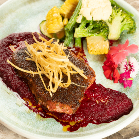 Atún marinado, sellado a la plancha, puré de betabel, verduras al vapor, decoración de tortilla de harina frita.