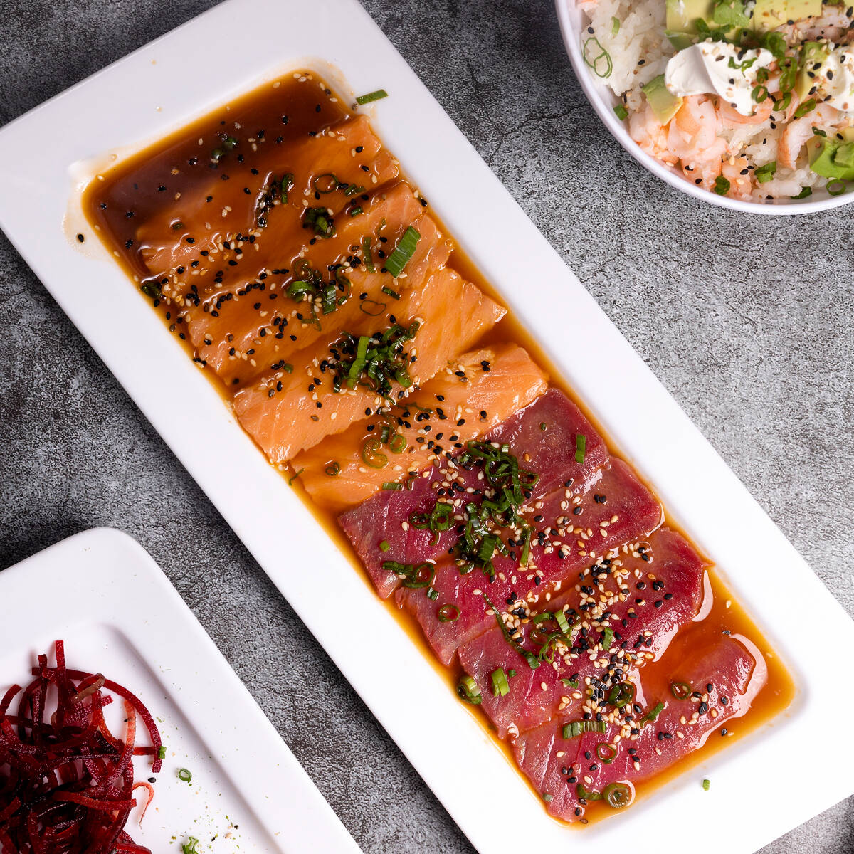 Cubo de atún fresco curtidos en limón, cebolla morada en juliana, aguacate y mezclados en una salsa oriental con un topping de poro frito, (por temporada no incluye mango).