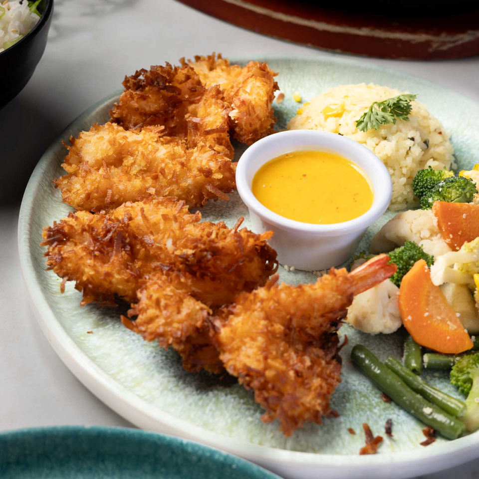 6 Camarones empanizados con coco, acompañados con verduras salteadas y arroz.