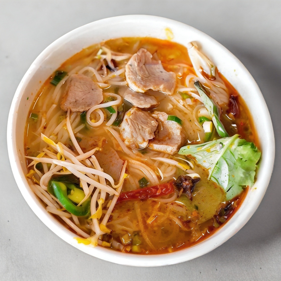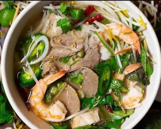 Sopa vietnamita con fideo de arroz, bistec de res, albóndiga de res, pollo, camarón, cebolla, cebollín y cilantro.