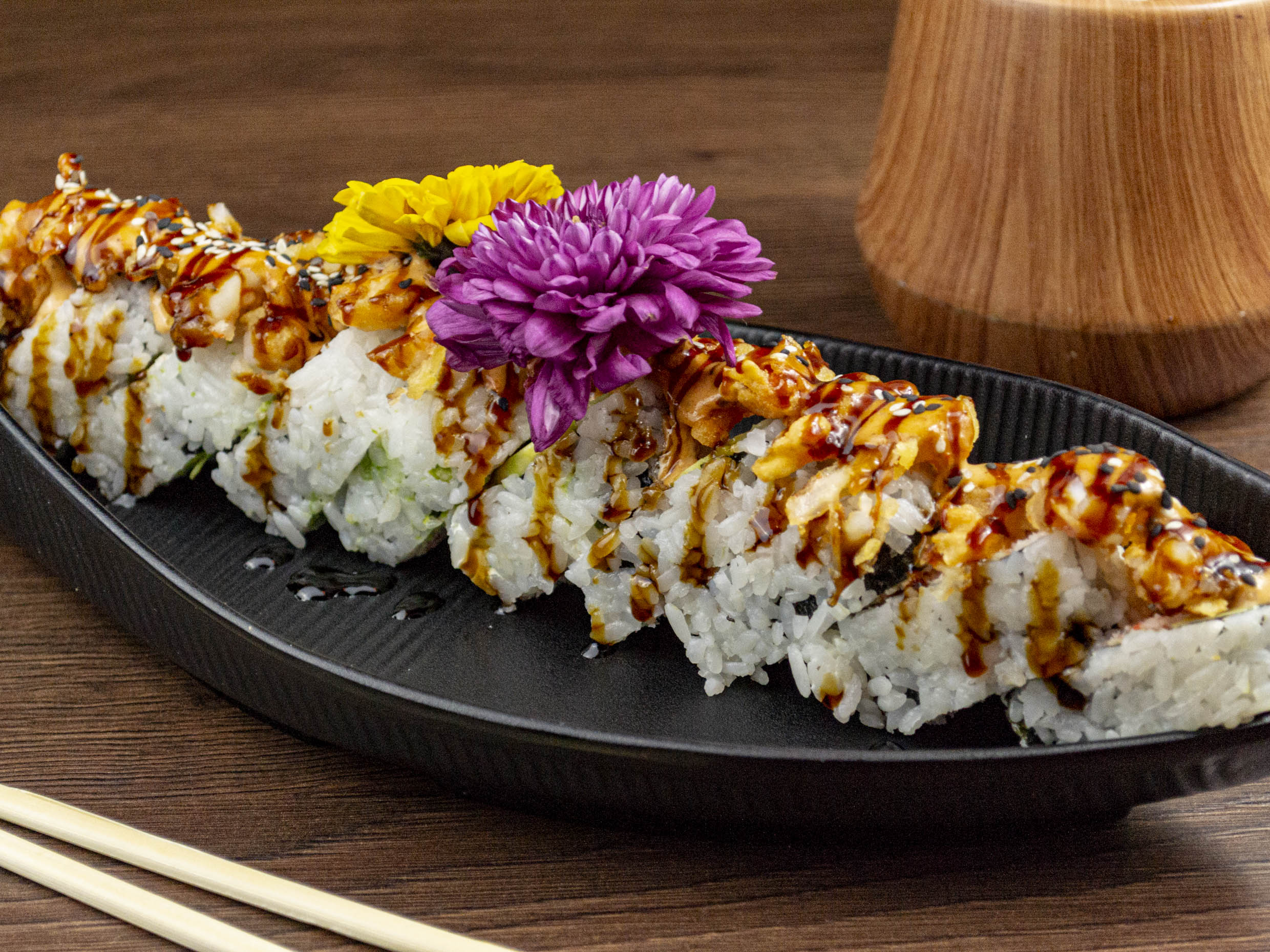 Rollo natural, relleno de aguacate, pepino, Philadelphia y tampico, encima camarón crunchy con salsa chipotle y salsa sushi.