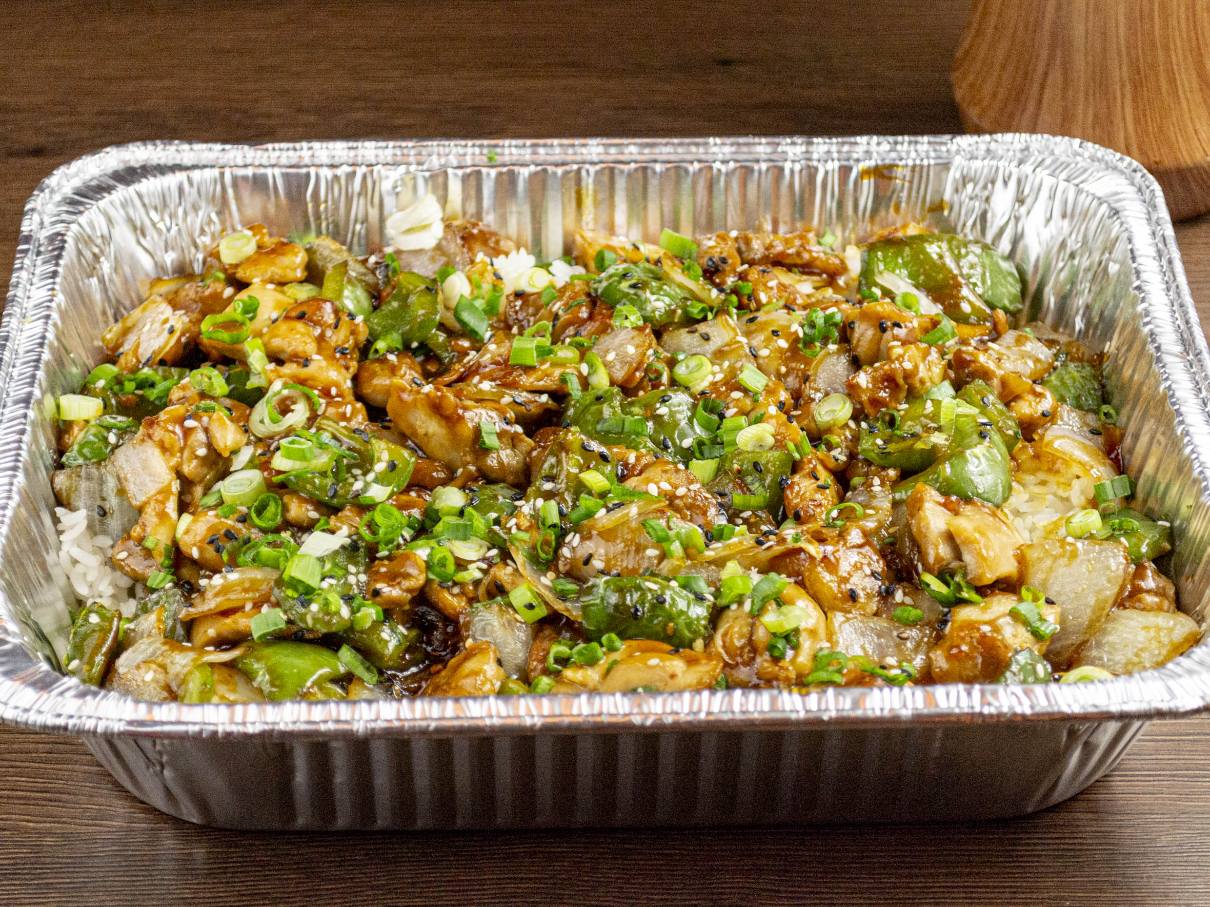 Teriyaki de pollo original con vegetal en cama de arroz y jazmín blanco.