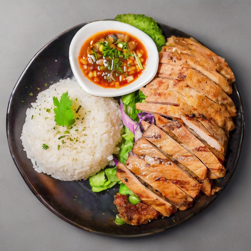 Chuleta de puerco marinado al estilo vietnamita con lemongrass, acompañado de arroz jazmín blanco y ensalada con aderezo.