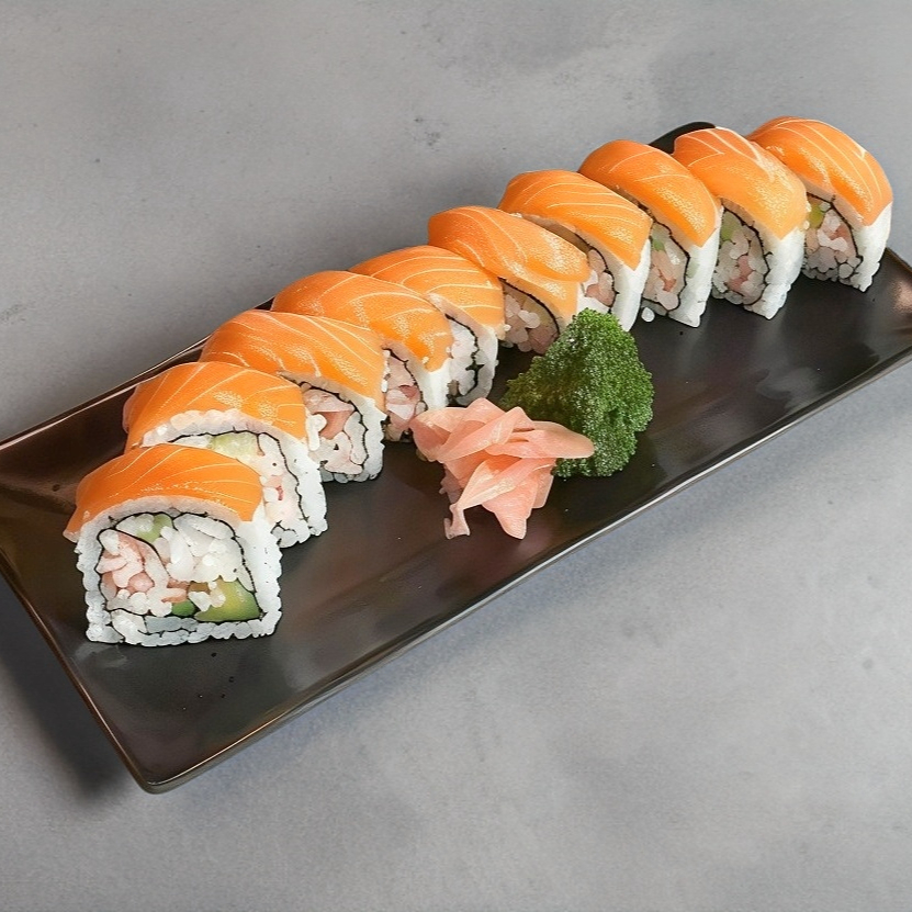 Rollo natural, relleno de aguacate, pepino, Philadelphia y tampico, forrado con salmón.