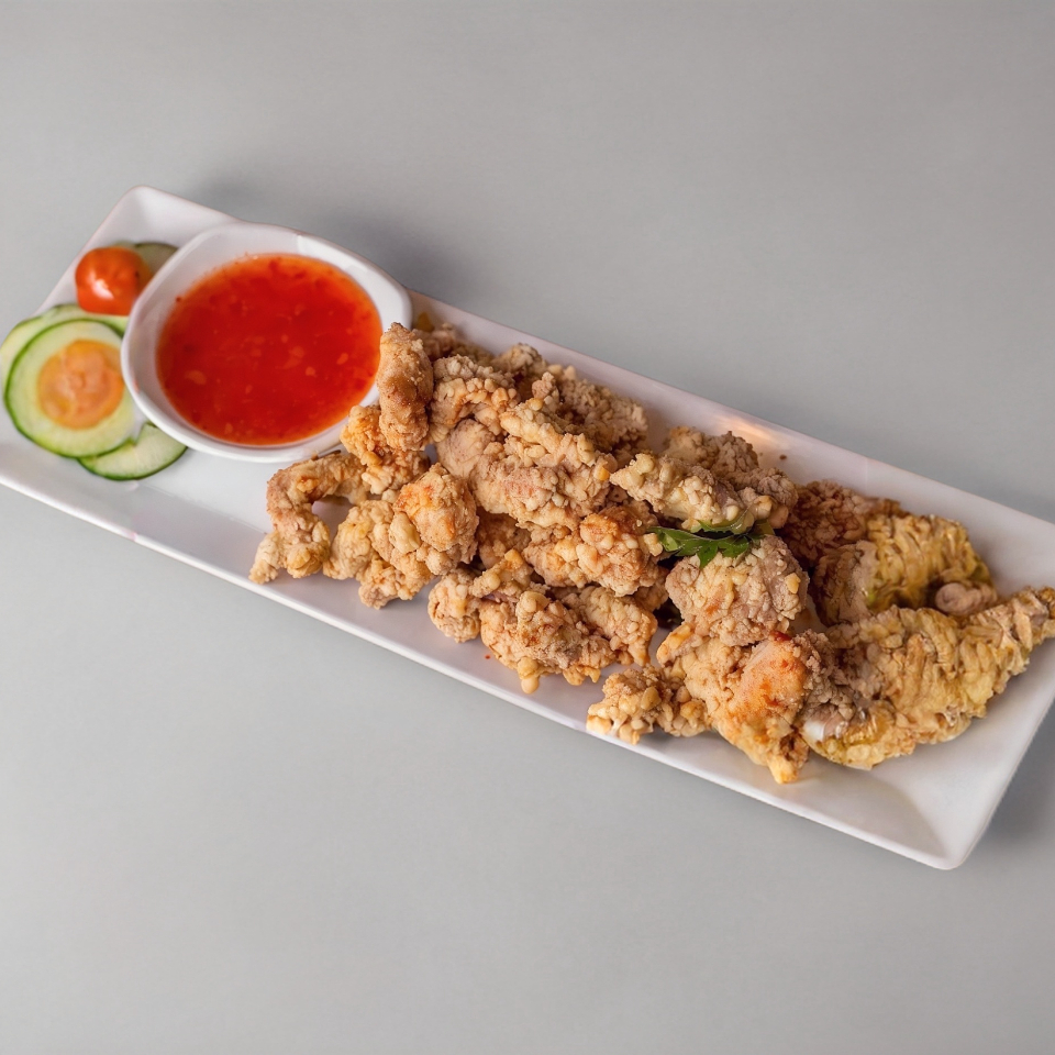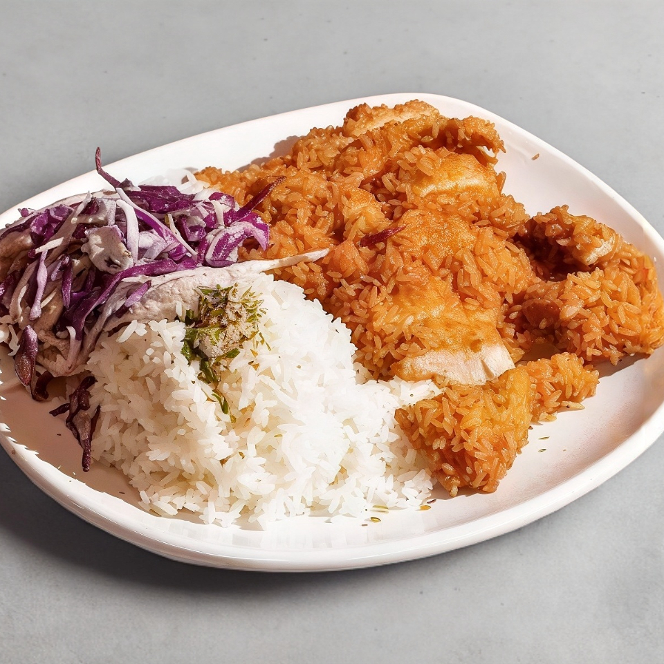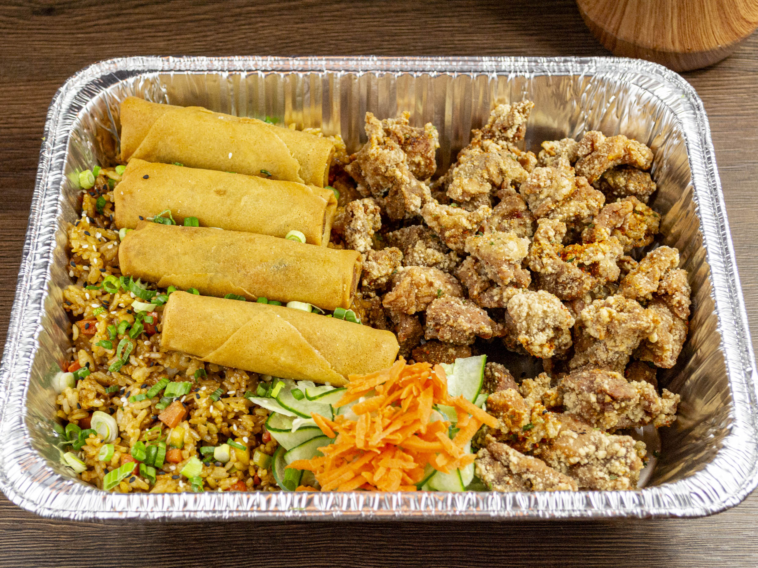 Cama de arroz frito con vegetal, popcorn chicken y 4 piezas chunkun vietnamita.