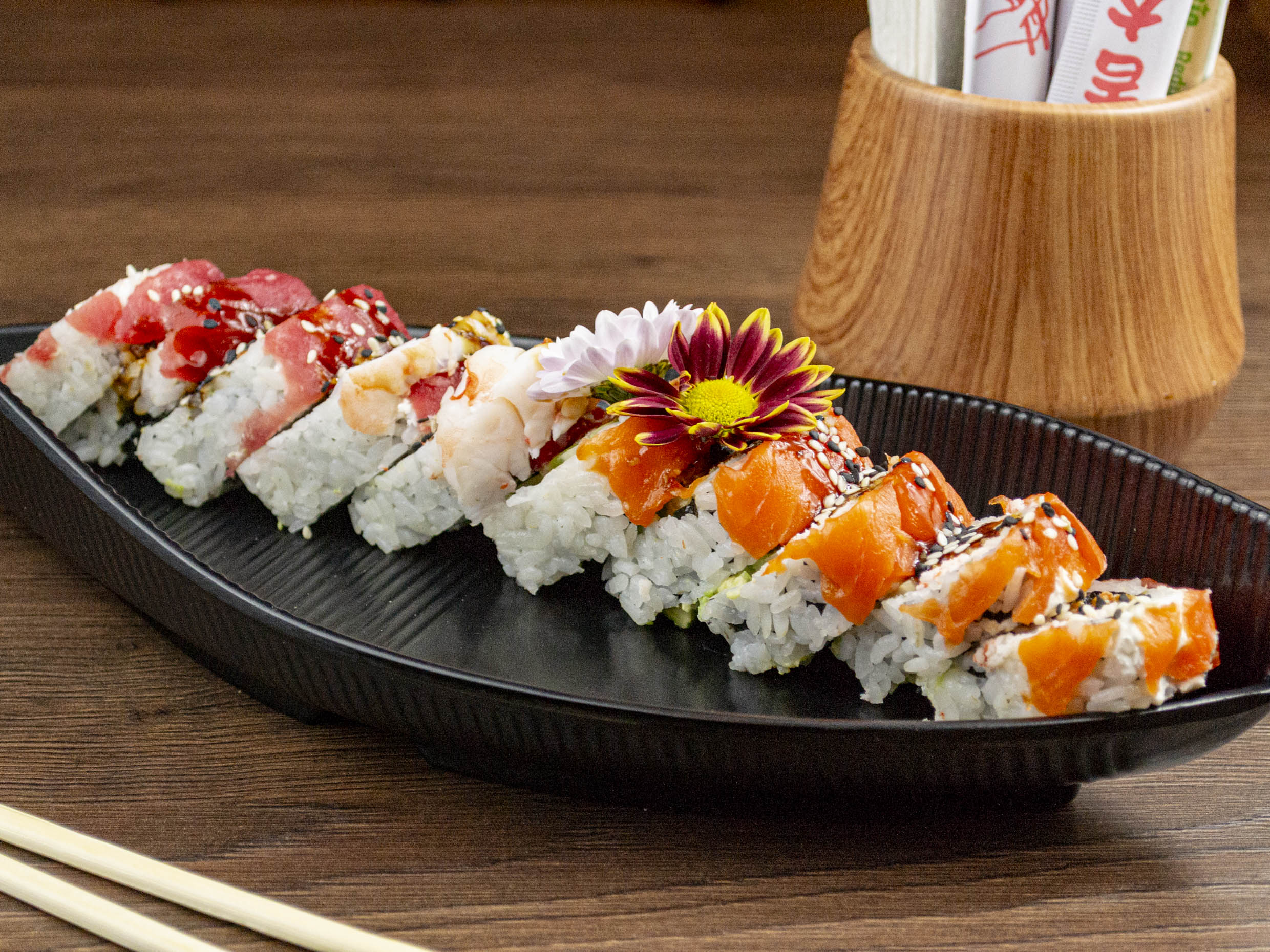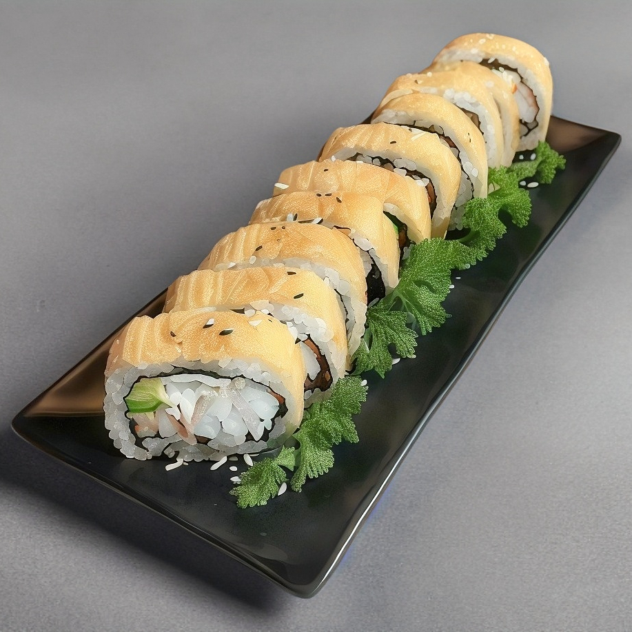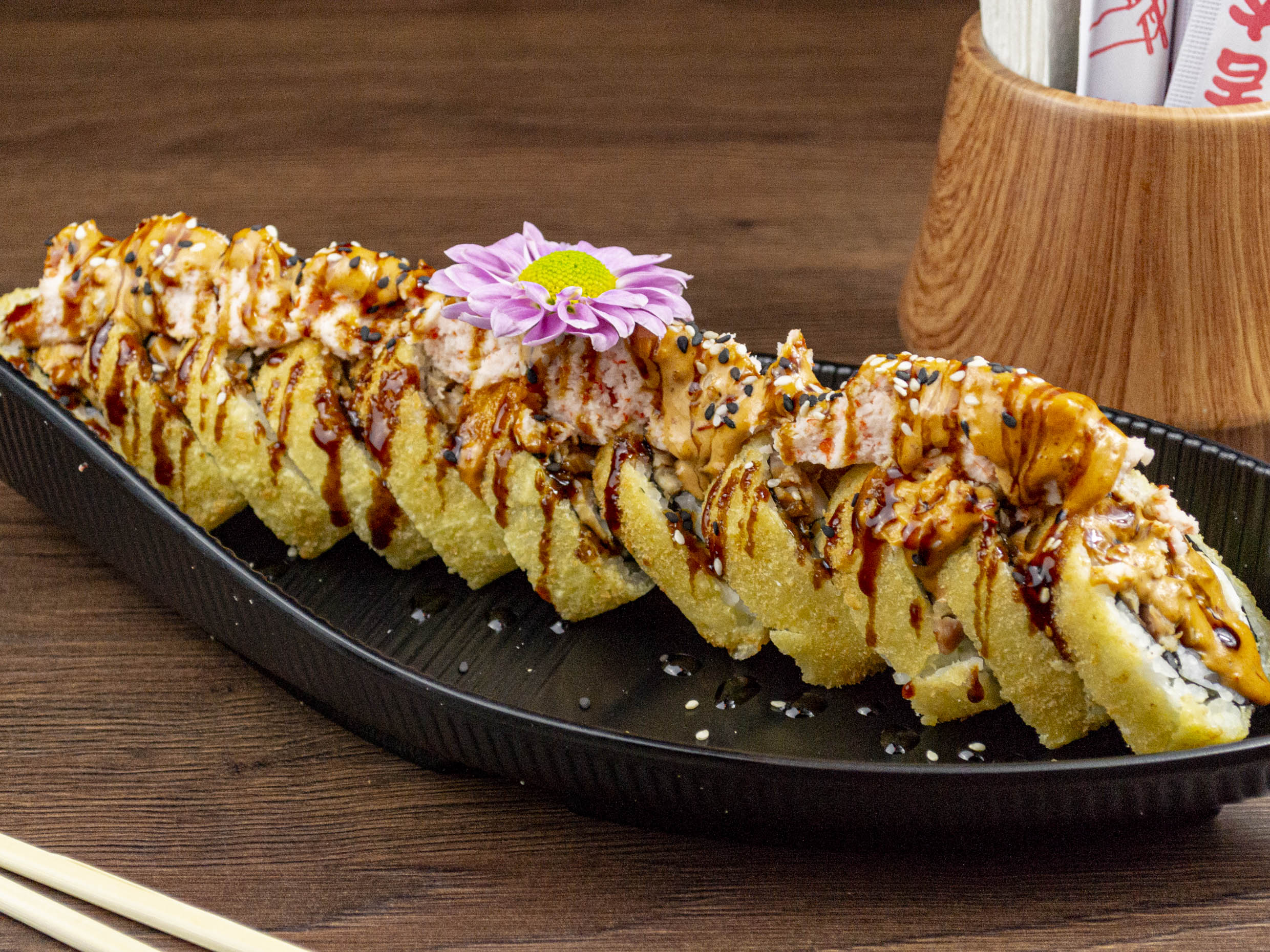 Rollo empanizado, relleno de aguacate, Philadelphia, pollo, camarón y res, con toque de ajonjolí.