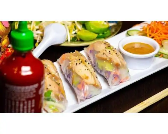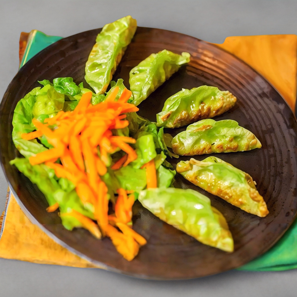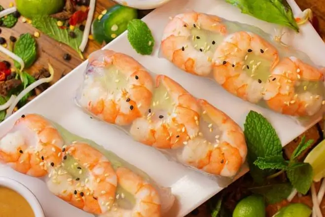 Hojas de arroz, relleno con verduras de templada con camarón y salsa de aguacate.