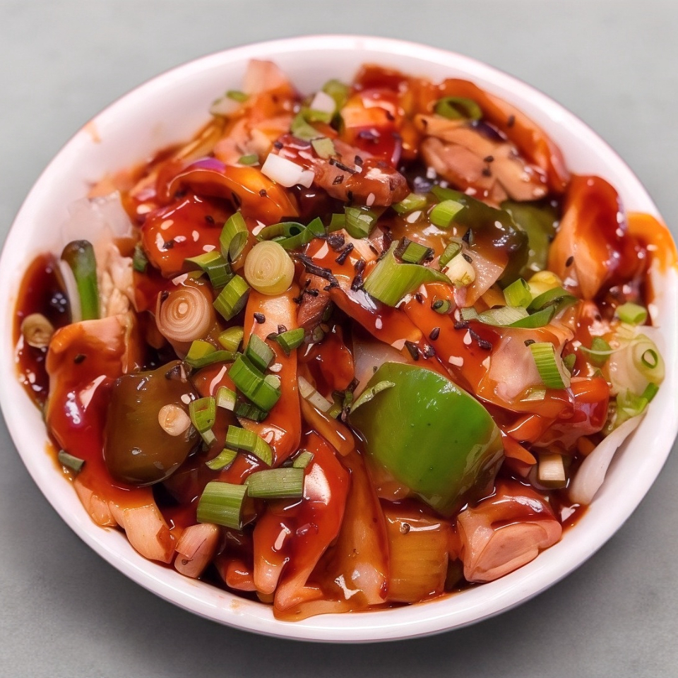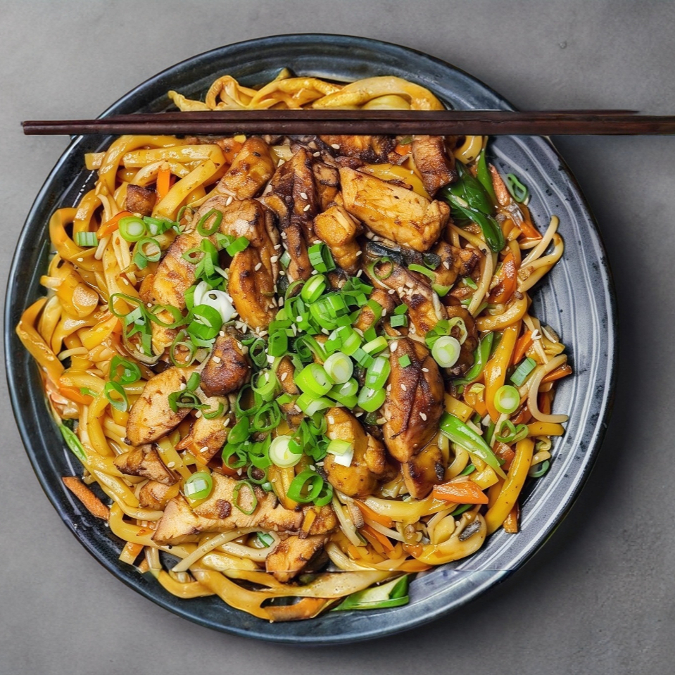 Udon a la plancha con salsa original asiática y pollo a la plancha.