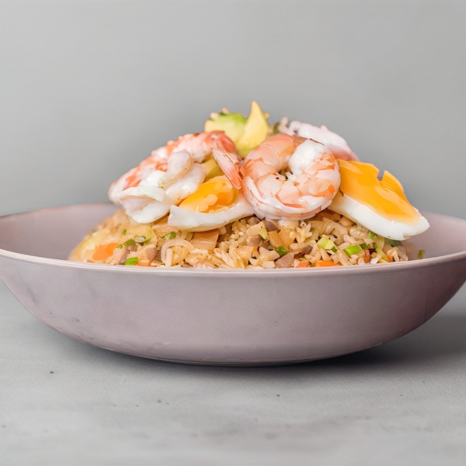 Bowl de arroz frito con verduras, camarón y/o pollo acompañado con surimi preparado.