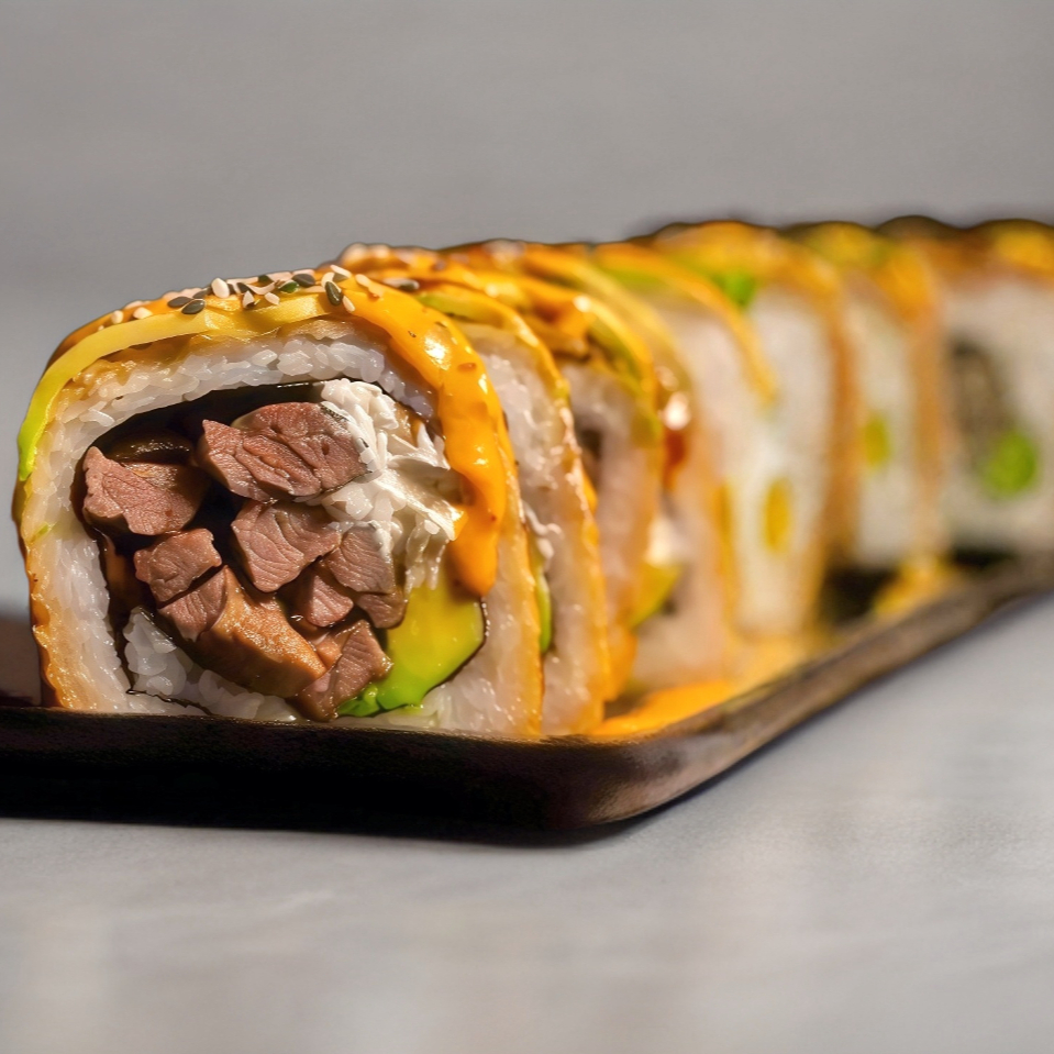 Rollo empanizado con aguacate, pepino, Philadelphia, res, por fuera con salsa de sushi y toque de ajonjolí.
