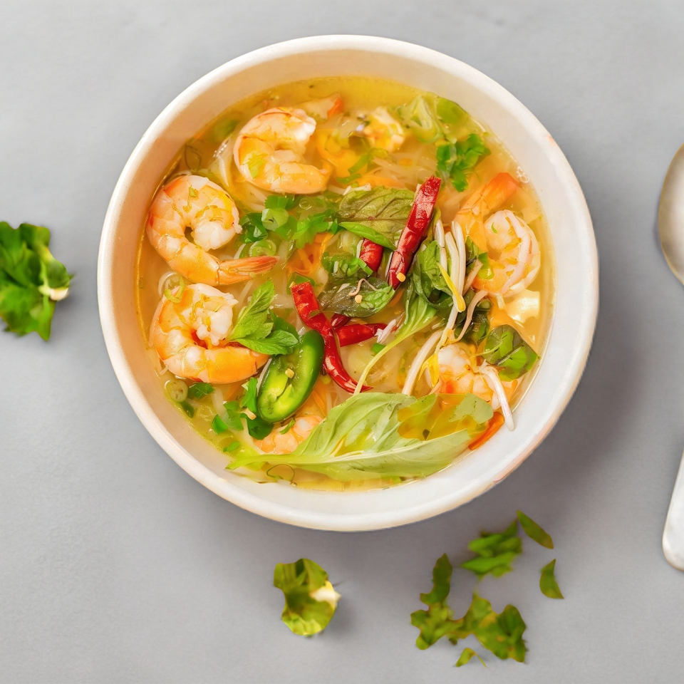 Sopa vietnamita con fideo de arroz, camarón, cebolla, cebollín y cilantro.