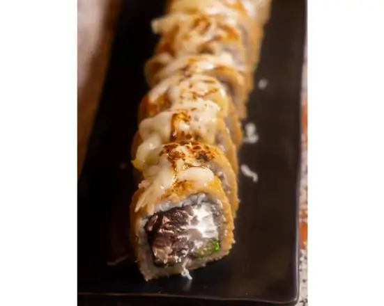 Rollo empanizado, relleno de aguacate, pepino, Philadelphia, pollo y res, por fuera con queso Monterrey flameado.