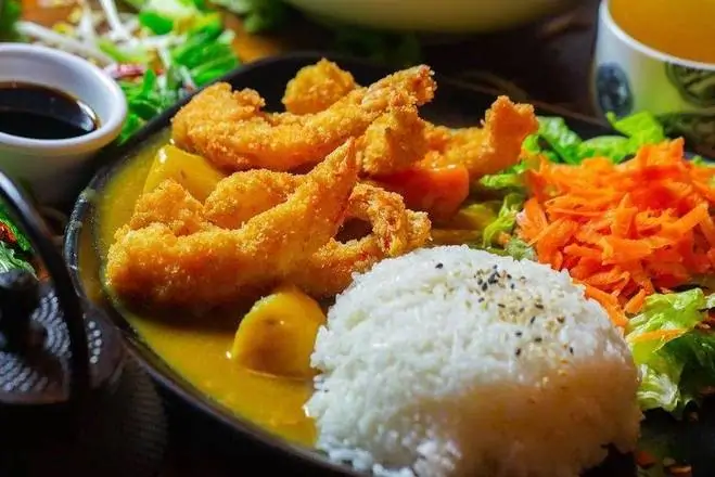 Camarón empanizado, acompañado con arroz blanco y ensalada con aderezo.
