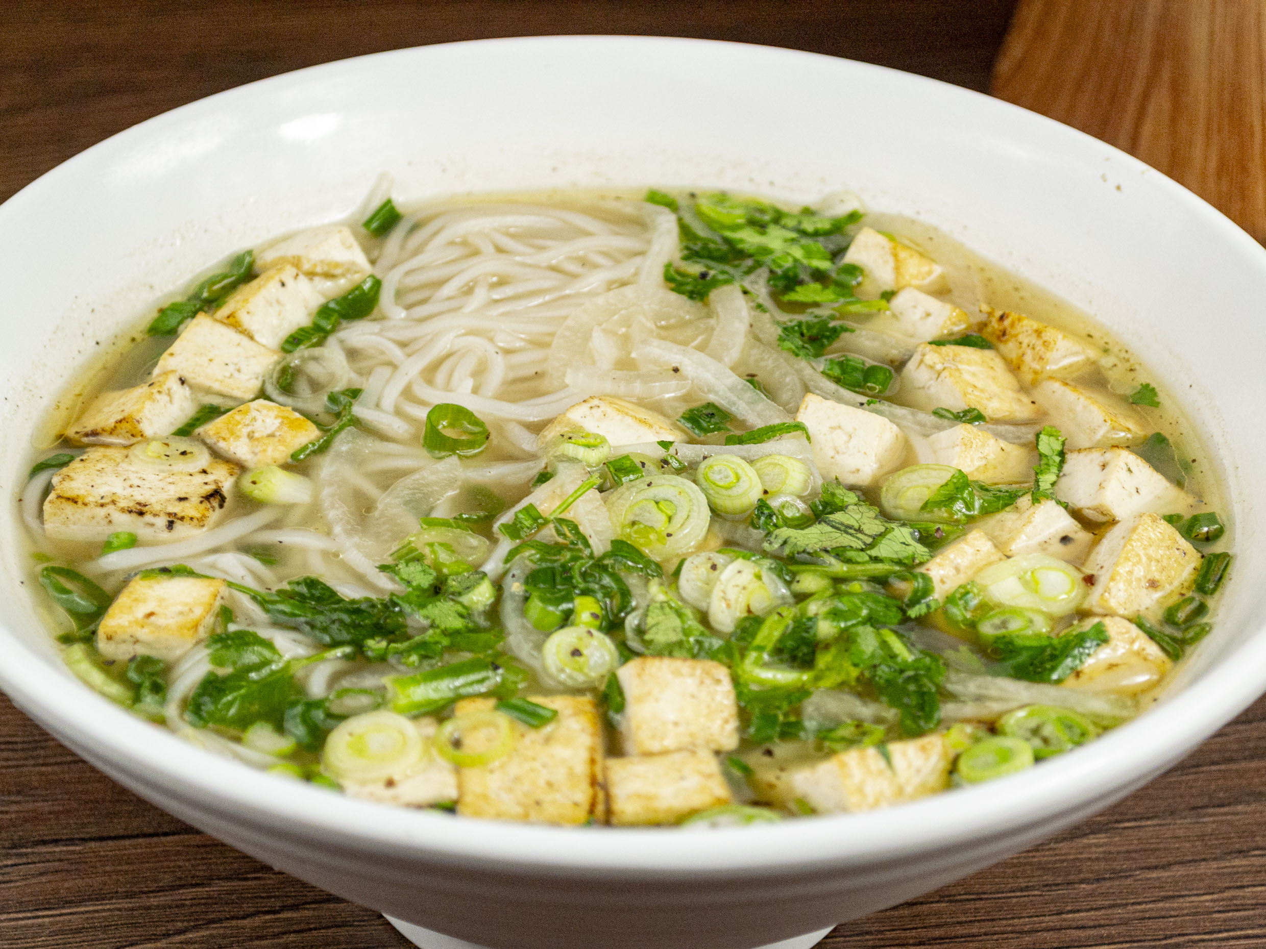 Sopa vietnamita con caldo a base de resacón, fideo de arroz, cebollitas y tofu de soya.