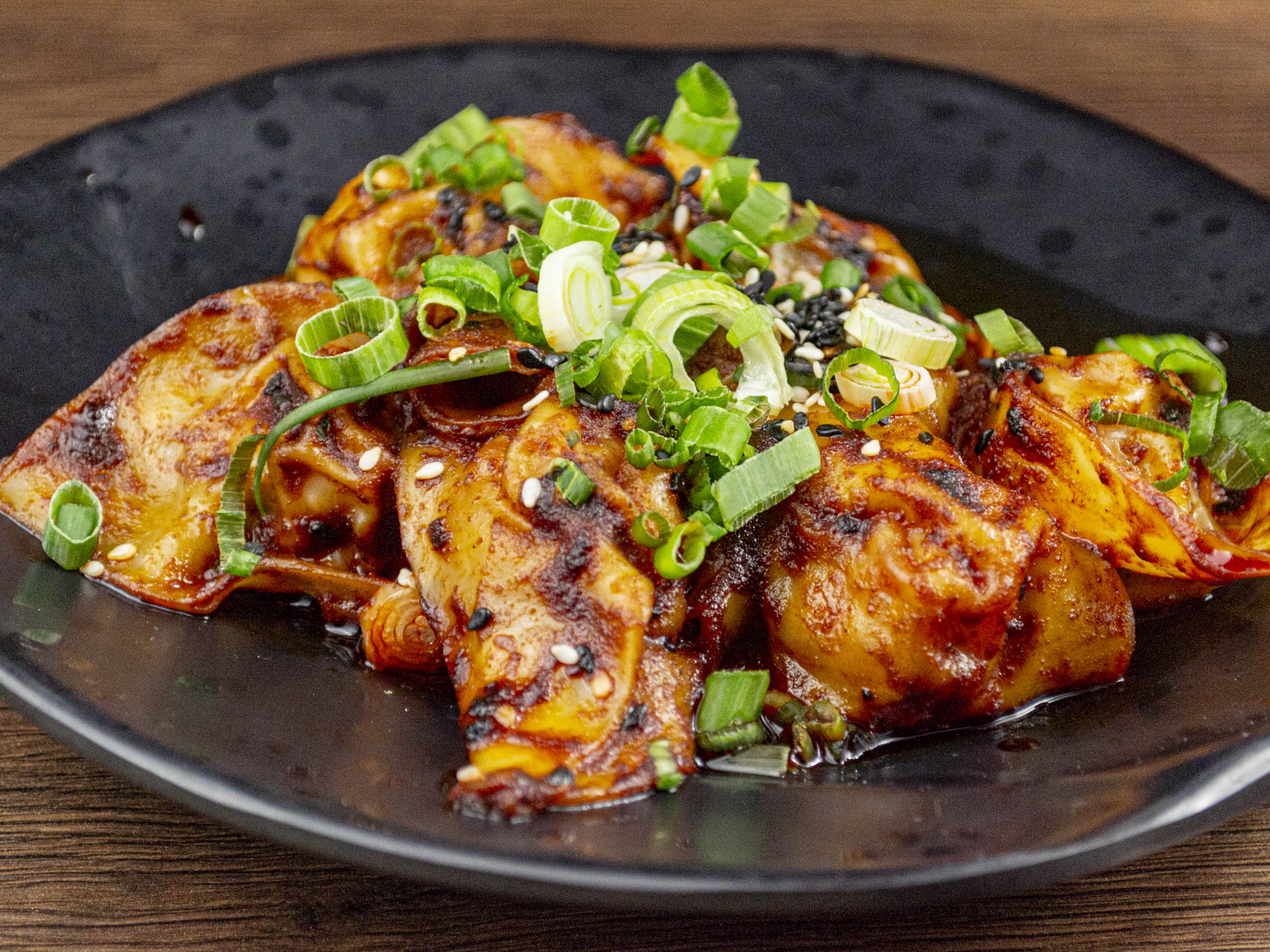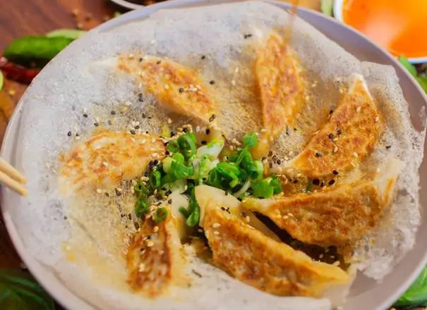 Relleno de puerco, camarón, aceite de chiles y cebollín.