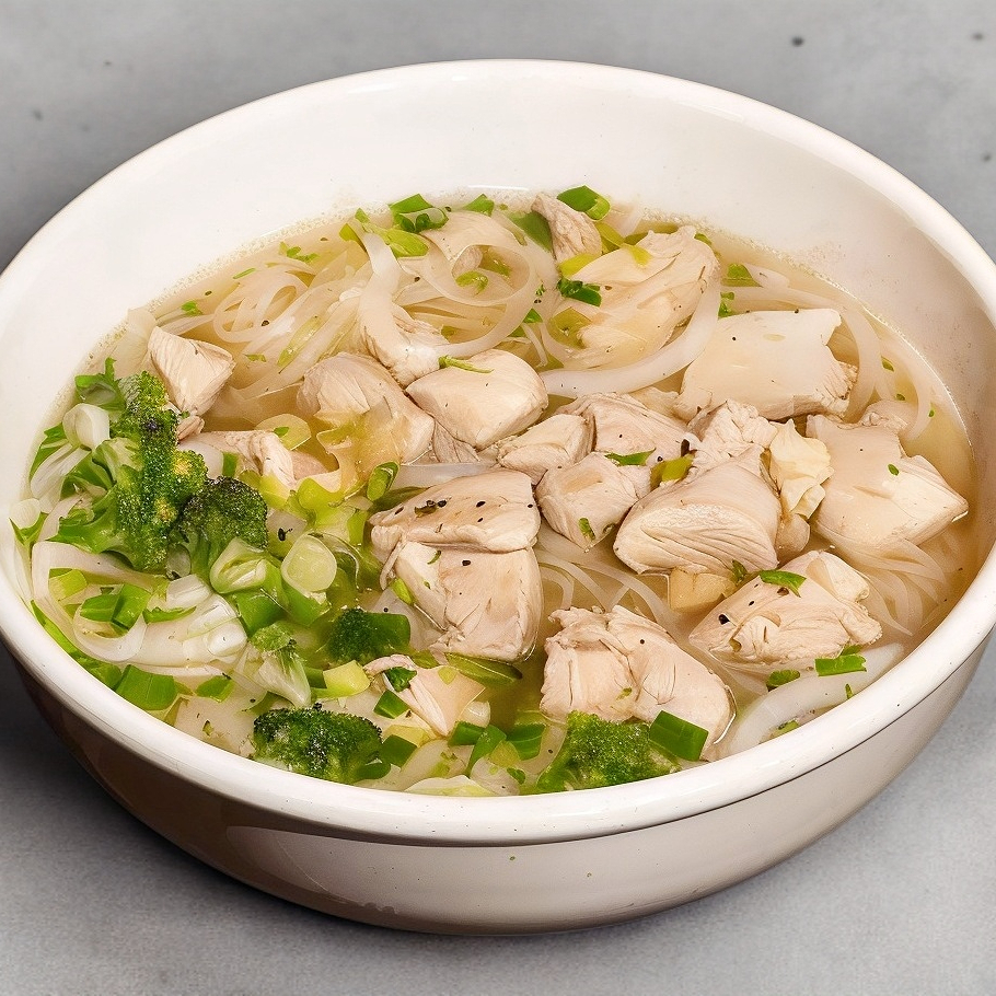 Sopa vietnamita con fideo de arroz, pollo, cebolla, cebollín y cilantro.