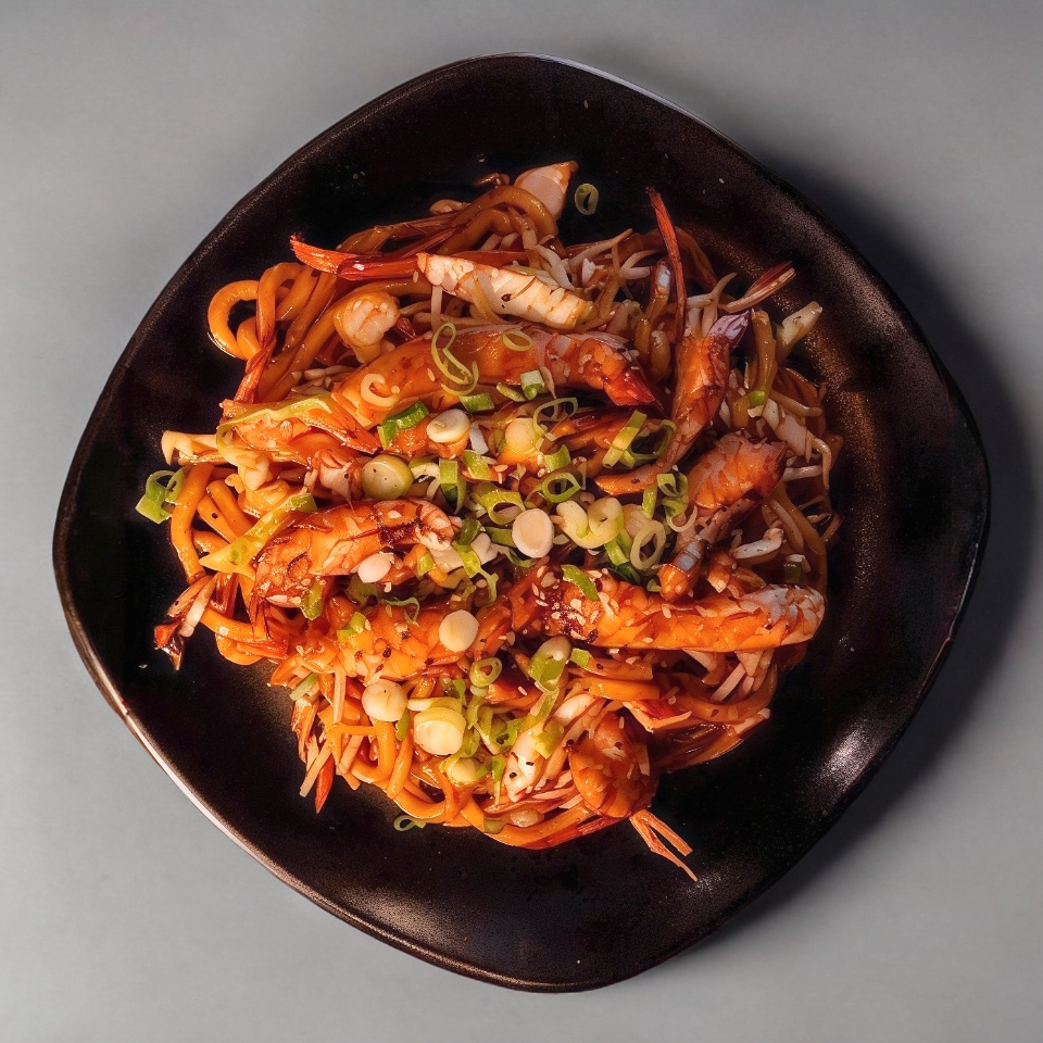 Udon a la plancha con verduras y salsa asiática con camarón.