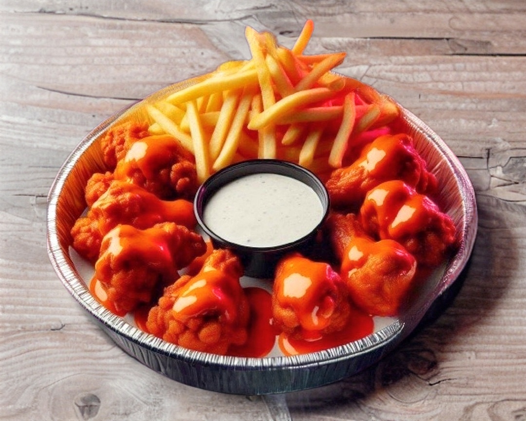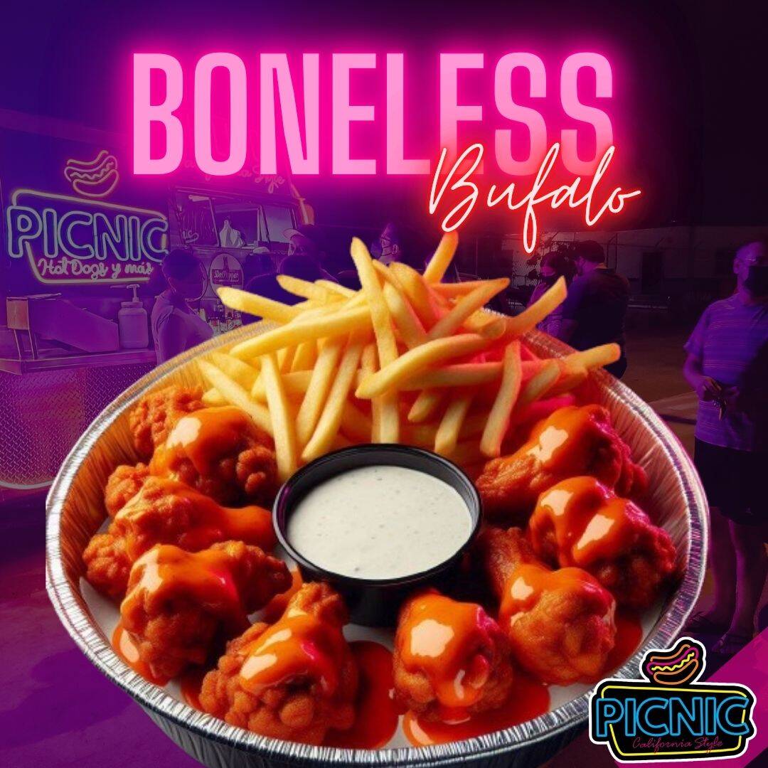 Descubre el sabor explosivo de nuestros boneless estilo búfalo, perfectamente crujientes y bañados en una salsa picante y deliciosa. Servidos sobre una cama de papas fritas doradas y crujientes, acompañados de un suave y cremoso aderezo Ranch para equilibrar el picante.
