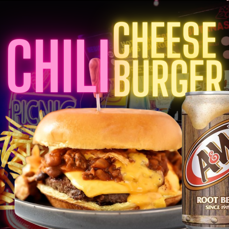 Manchosa y deliciosa , 2 jugosas carnes, queso americano,bañadas en chilibeef y queso cheddar en pan brioche se acompaña de papas fritas