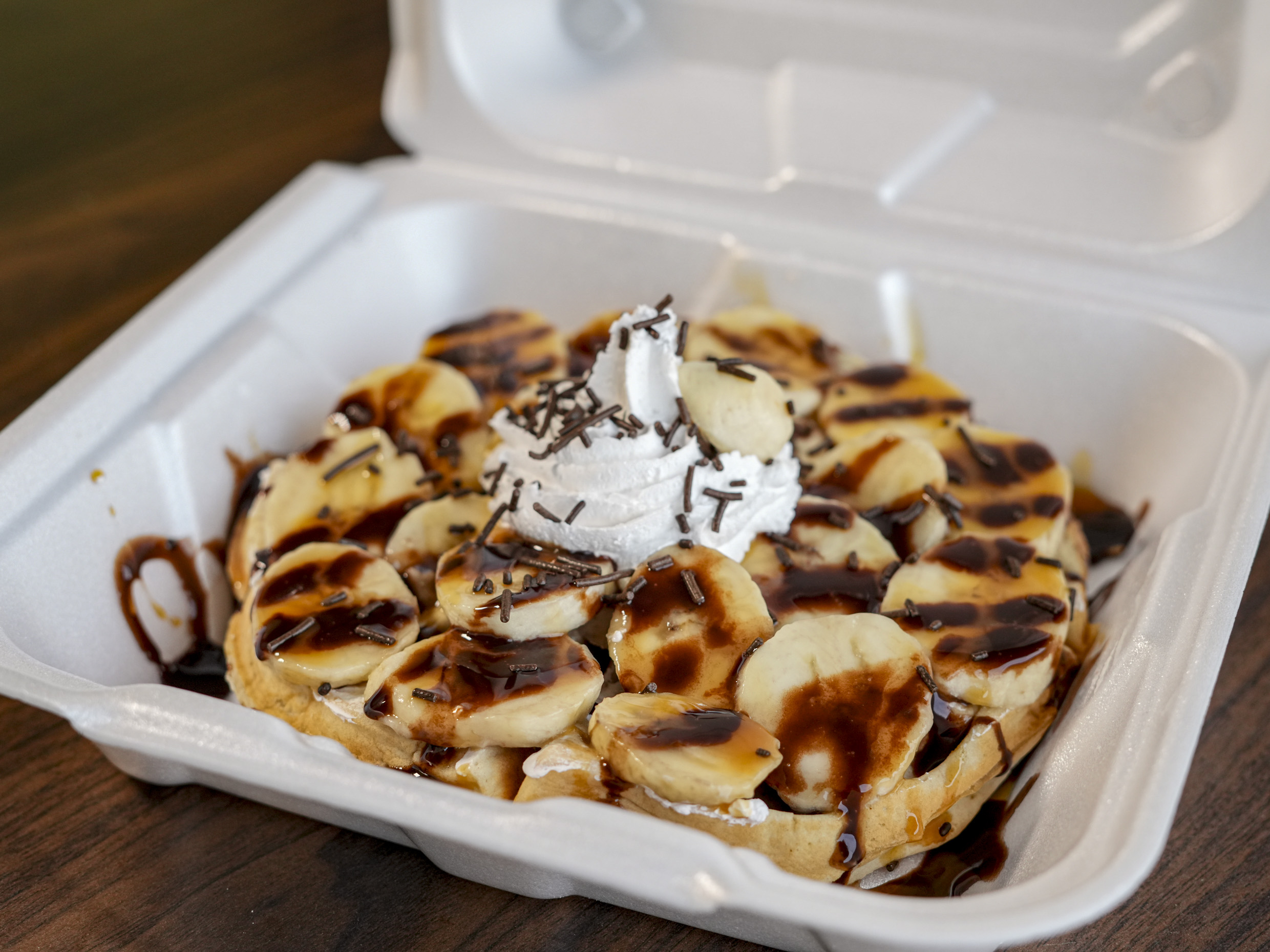 Deliciosos waffles esponjosos, servidos con fresas o plátanos frescos, con un topping a eleccion (Lechera, caramelo, chocolate)