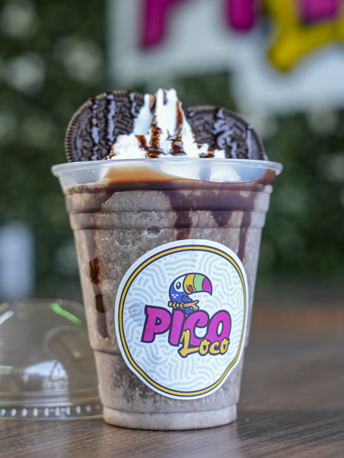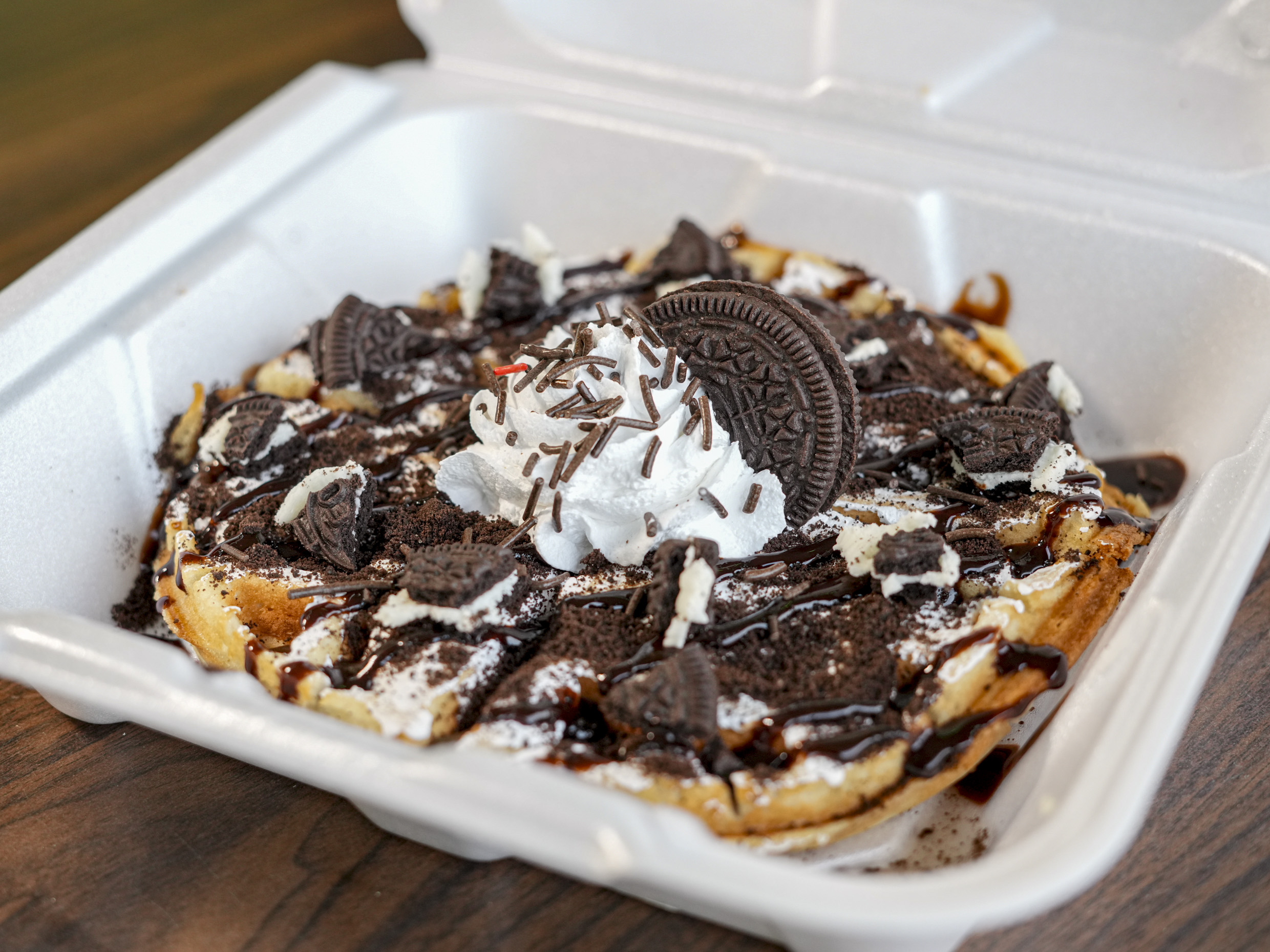 Waffle con crema de vainilla, oreo y chocolate liquido.