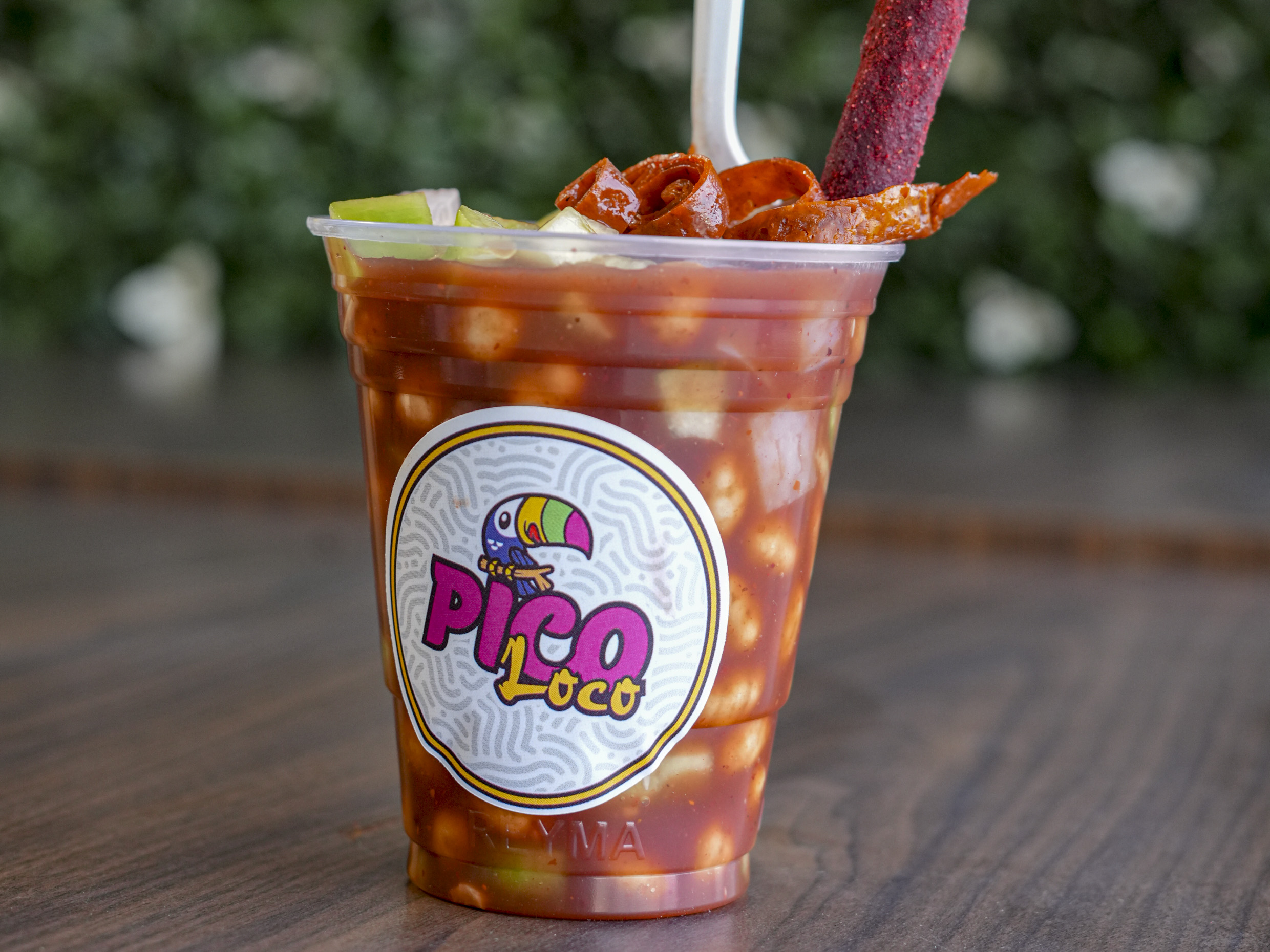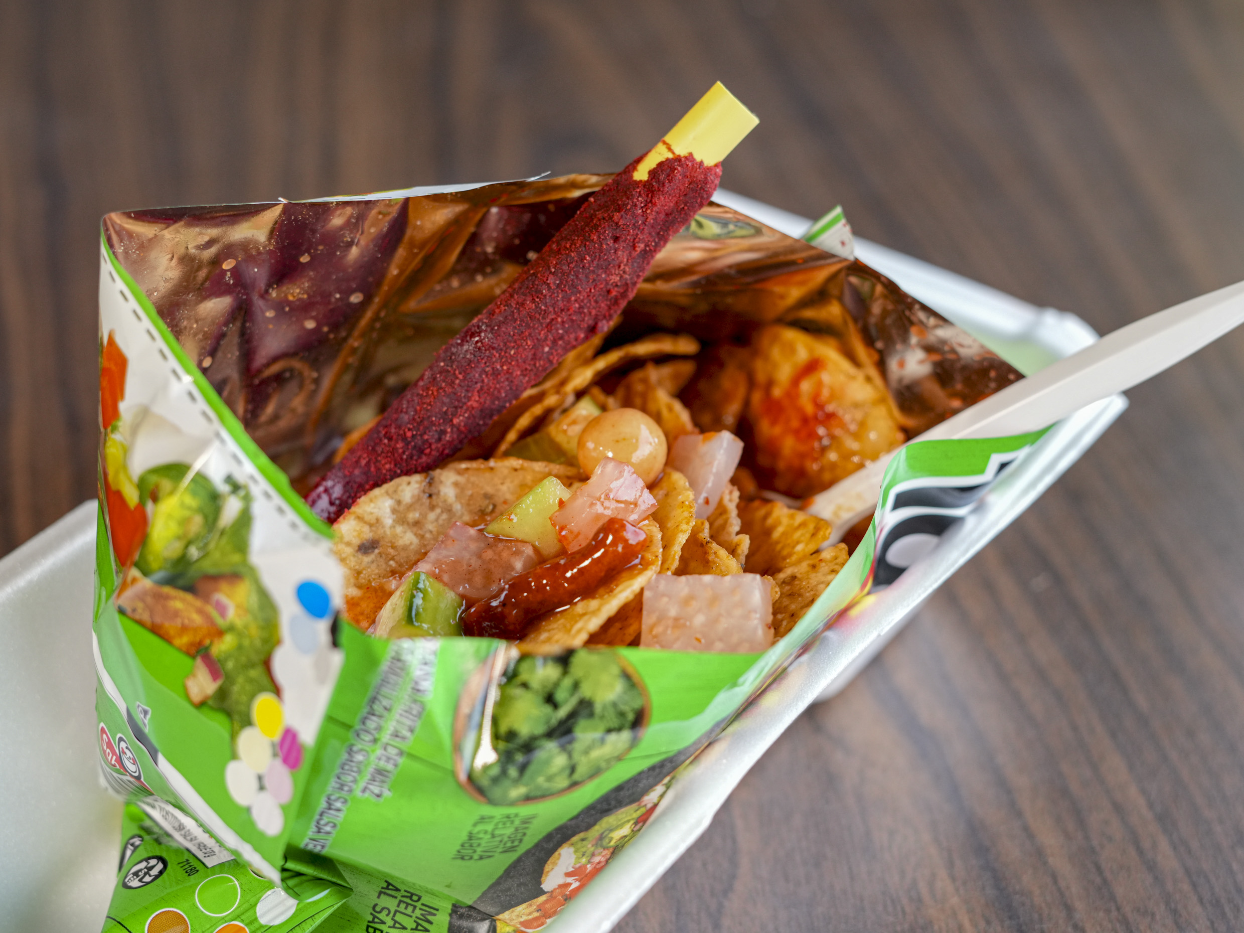 Una mezcla crujiente de papitas, chamoy, salsas picantes, pepino, cuerito y mas.