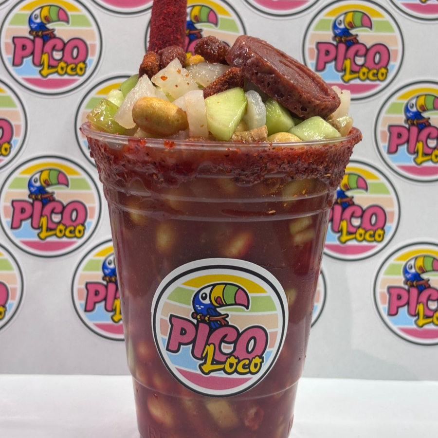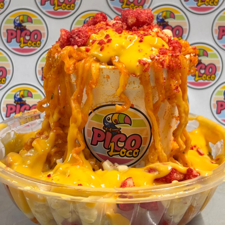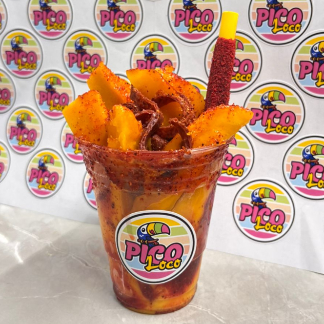 Una mezcla crujiente de papitas, chamoy, salsas picantes, pepino, cuerito, rielito y tarugo.